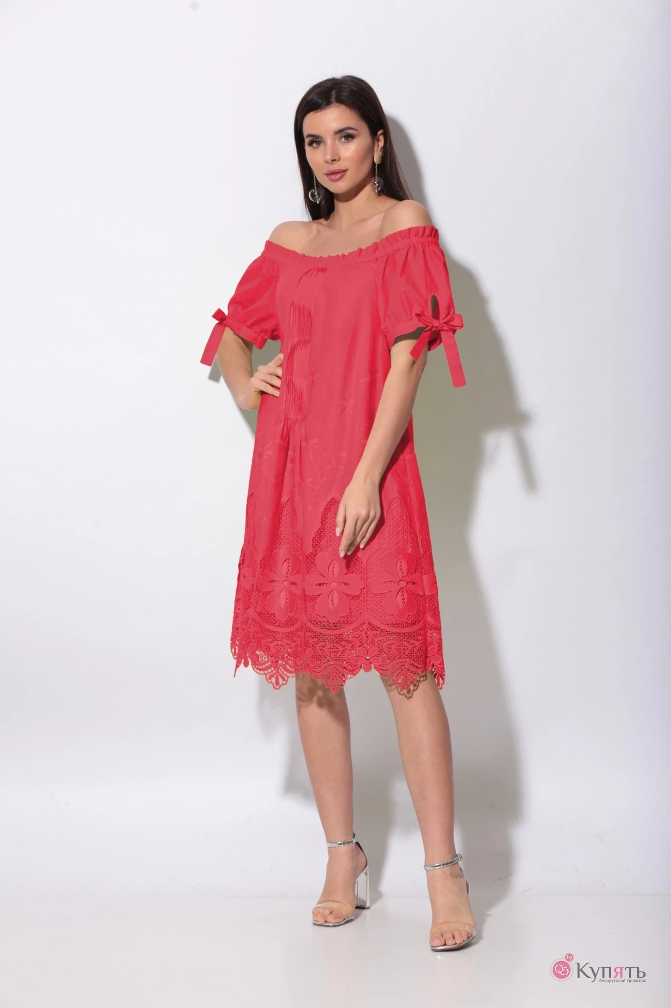 Летнее женское платье свободного силуэта выполнено из хлопчатобумажной ткани с вышивкой. По переду платья заложены мелкие складки, горловина круглая с рюшей, собрана на резинку. Рукава реглан, по низу обработана «слезка» и завязывающийся манжет. По низу платья широкий вышитый купон. Платье на хлопчатобумажной подкладке.