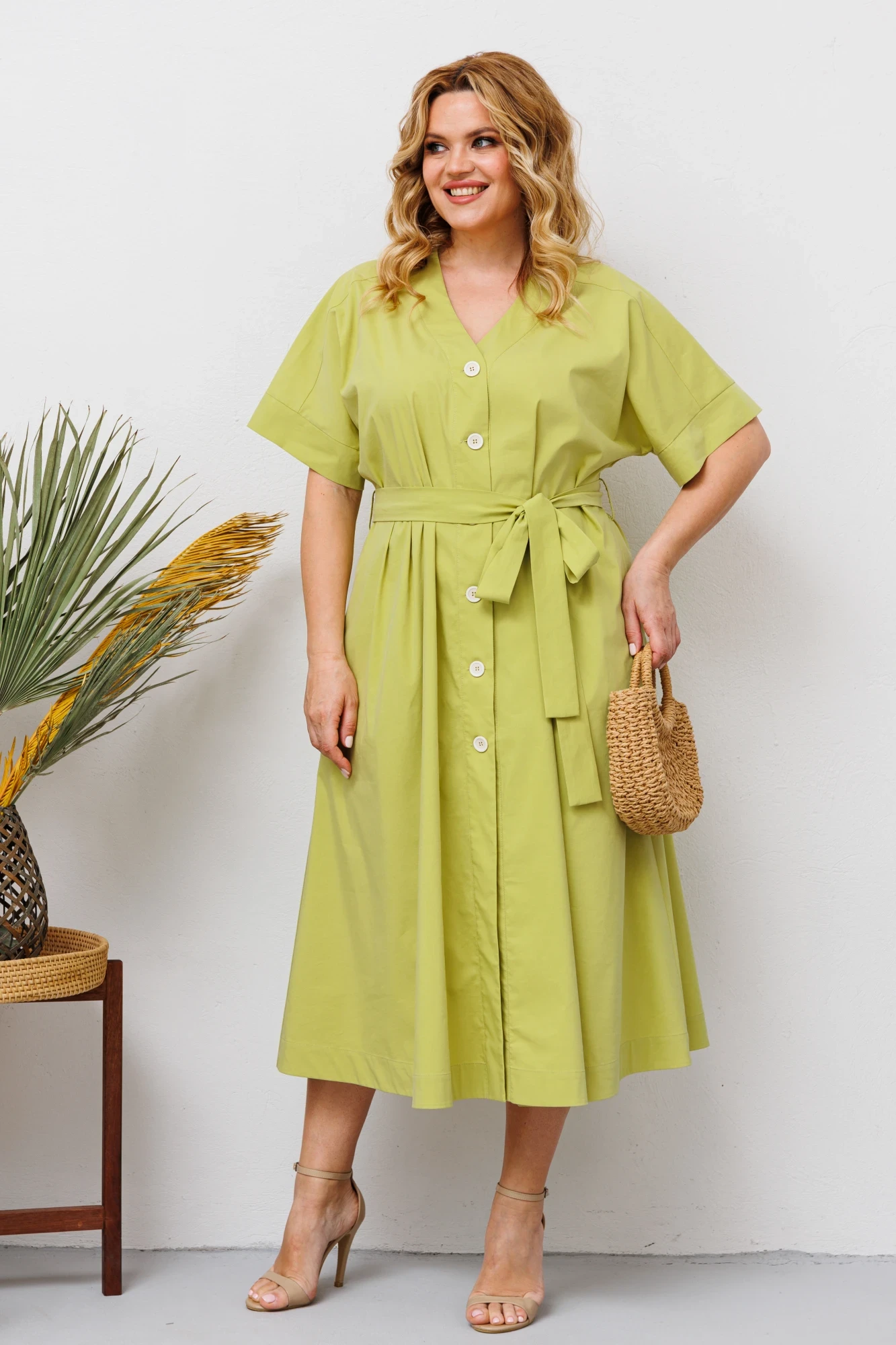Платье - рубашка романтичного силуэта. застежка по переду на пуговицы. В комплекте идет пояс из основной ткани. Рукав короткий цельнокроенный. В боковом шве расположены карманы. По переду на юбке складки, сзади сборка. Длина - 115 см
