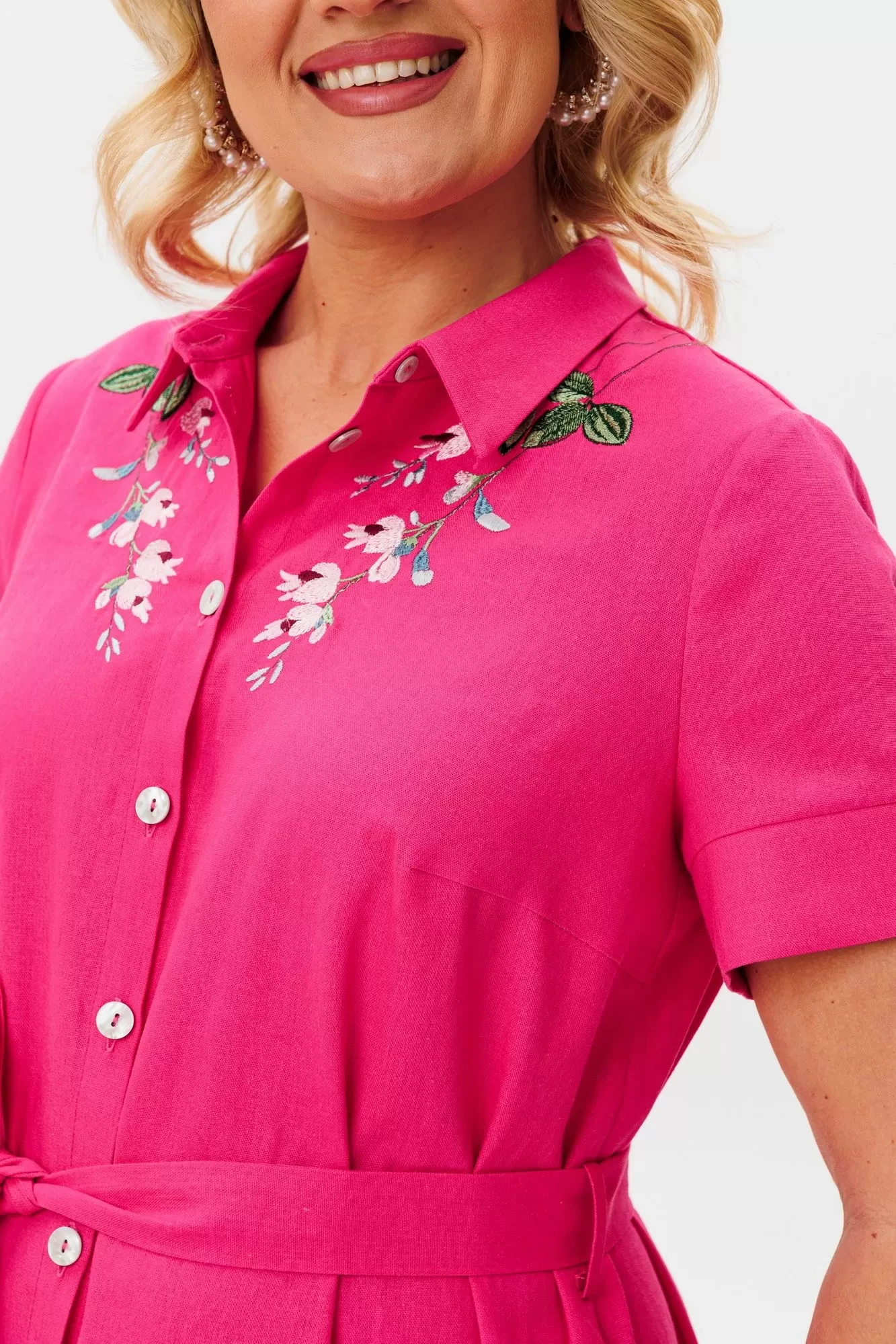 Платье из мягкого натурального льна с вискозой, длина макси прямого силуэта. Застежка по переду, на пуговицы. имеется нагрудная вытачка. Акцент сделан на дизайнерскую вышивку. Воротник классический. Спинка с кокеткой и сборкой от нее. В комплекте идет пояс из основной ткани. В боковых швах расположены карманы. Рукав короткий с манжетой. Длина - 132 см