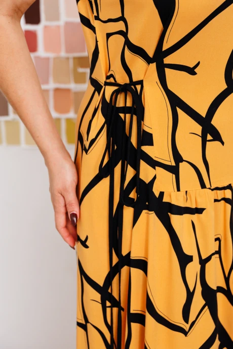 Платье имеет свободный силуэт, это позволяет рекомендовать их женщинам с сами разными типами фигур. Плечо спущенное цельнокроенный рукав. Вырез горловины округлый, застегивается на пуговицу со стороны спинки. Длина макси, идеально подходит для любого типа фигуры и стройнит ее . Главный акцент в этой модели - наклонная линия подреза переда со сборкой по юбке переда. Дополняет его фрагментарный «игривый» поясок-шнурок с правого бока переда . Благодаря этому платье выглядит эффектно и подчеркивает женственность. В боковых швах платья карманы.