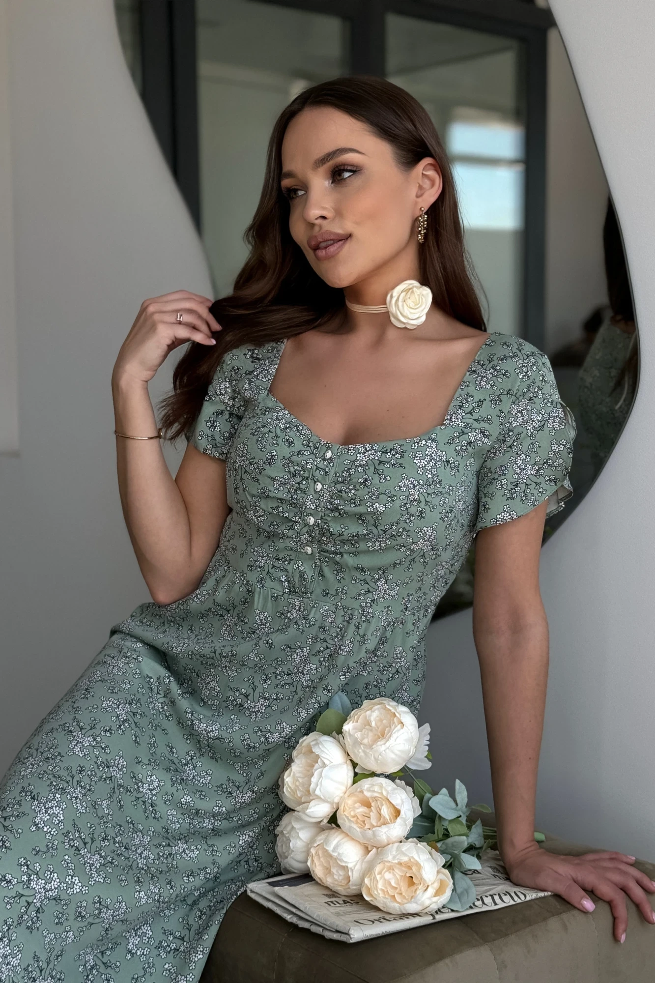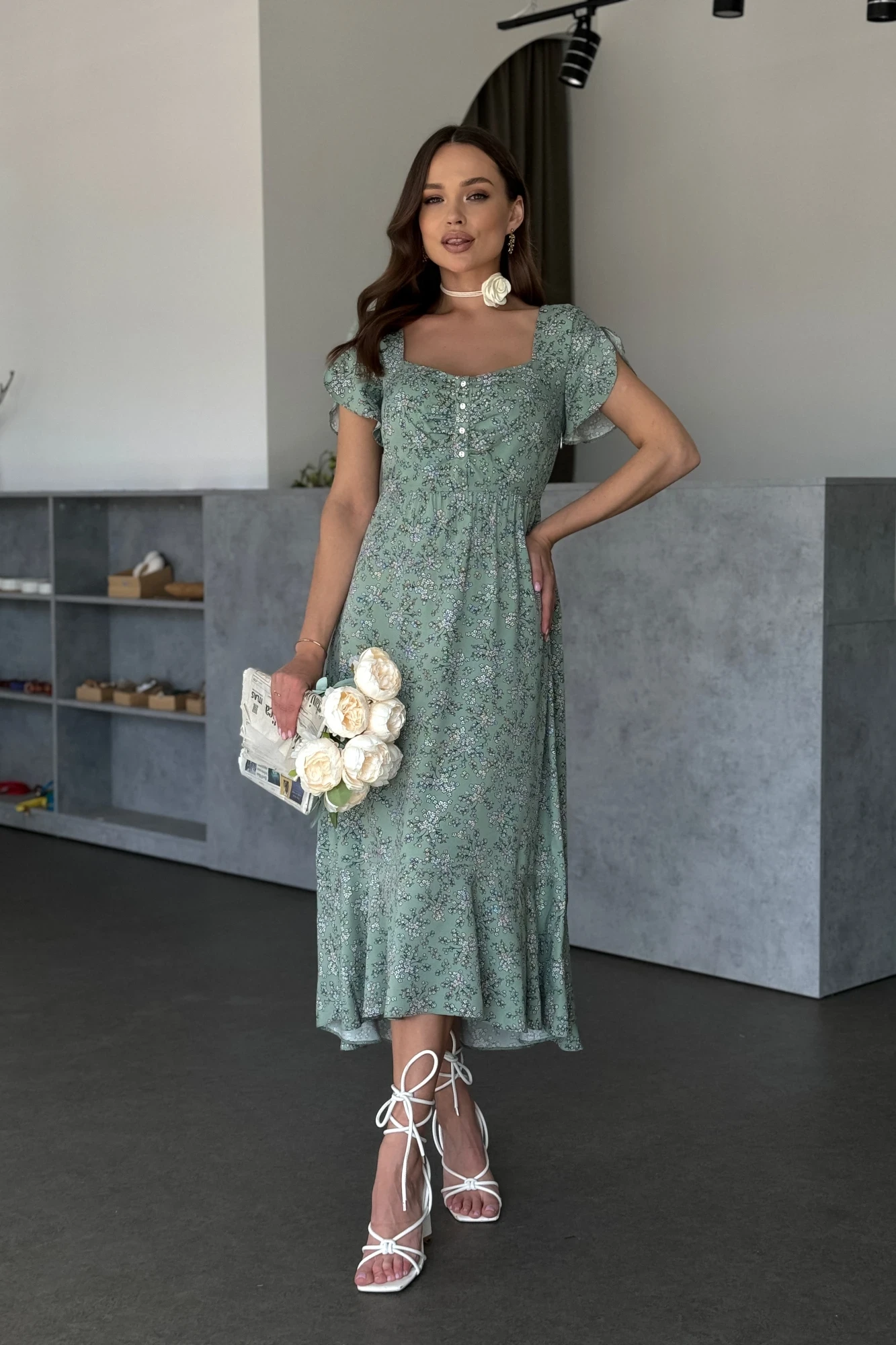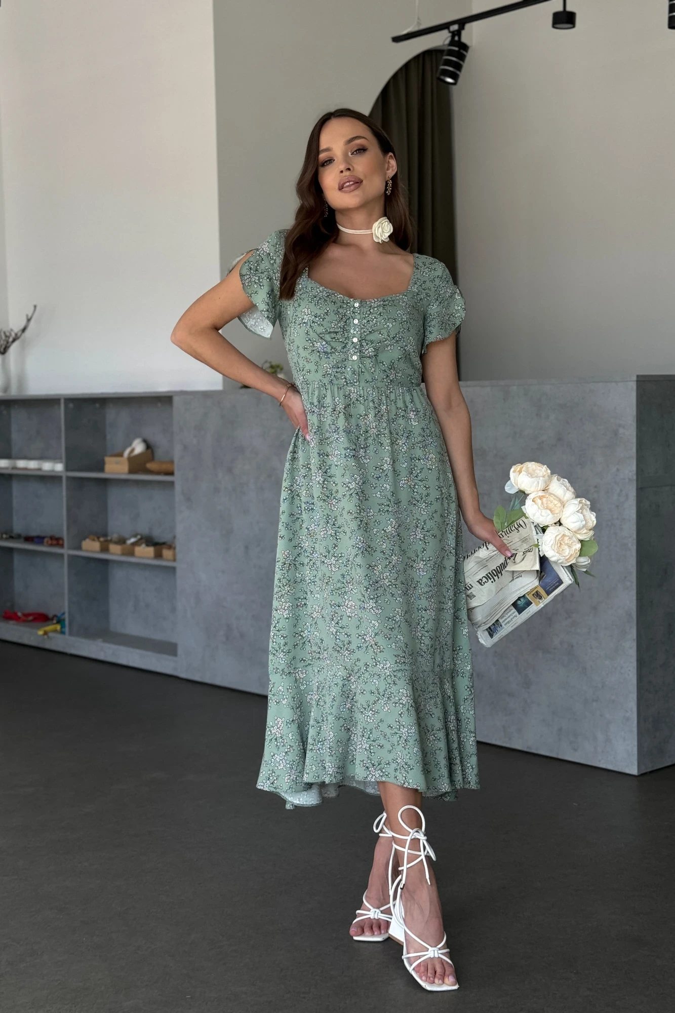 Платье полуприлегающего силуэта, отрезное по линии талии, длинное с ассиметричной длинной переда и спинки. Вырез горловины «каре».