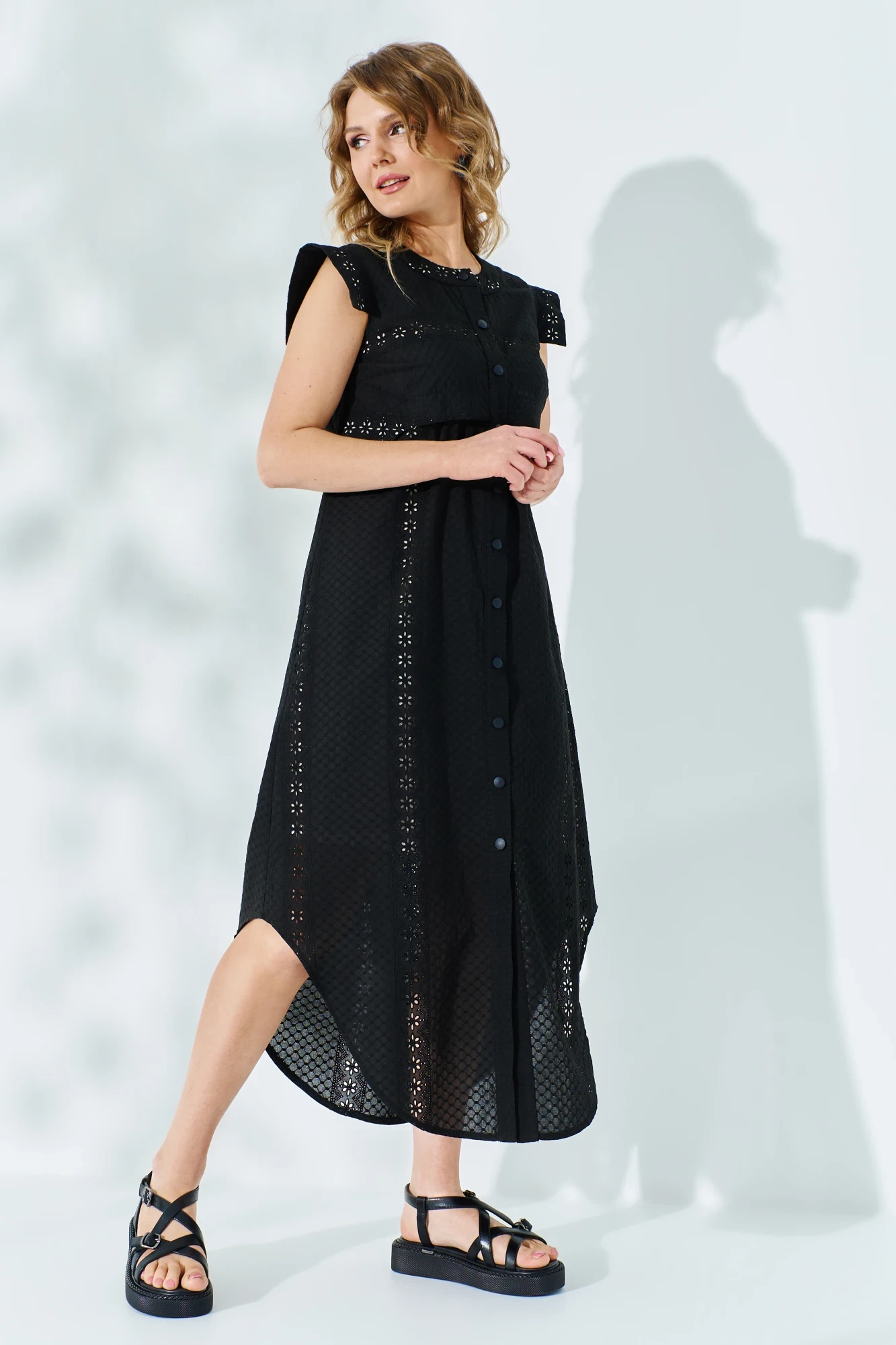 Платье – рубашка, выполнено из хлопковой ткани с вышивкой. Горловина - округлая, плосколежащая стойка. По лифу расположены кокетки в разном направлении рисунка вышивки. Низ-фигурный. Длина изделия по центральному шву спинки 124 см. Длина изделия по боковому шву до выреза (разреза) 75 см