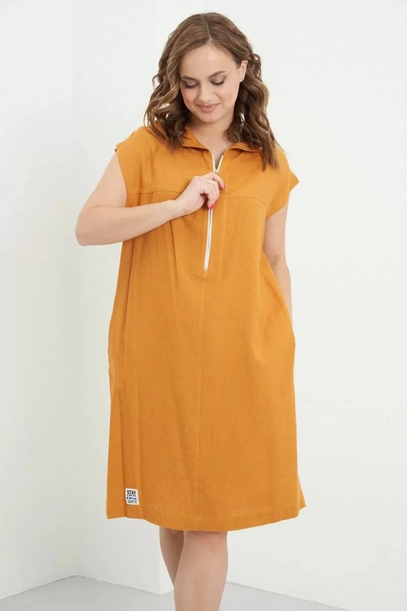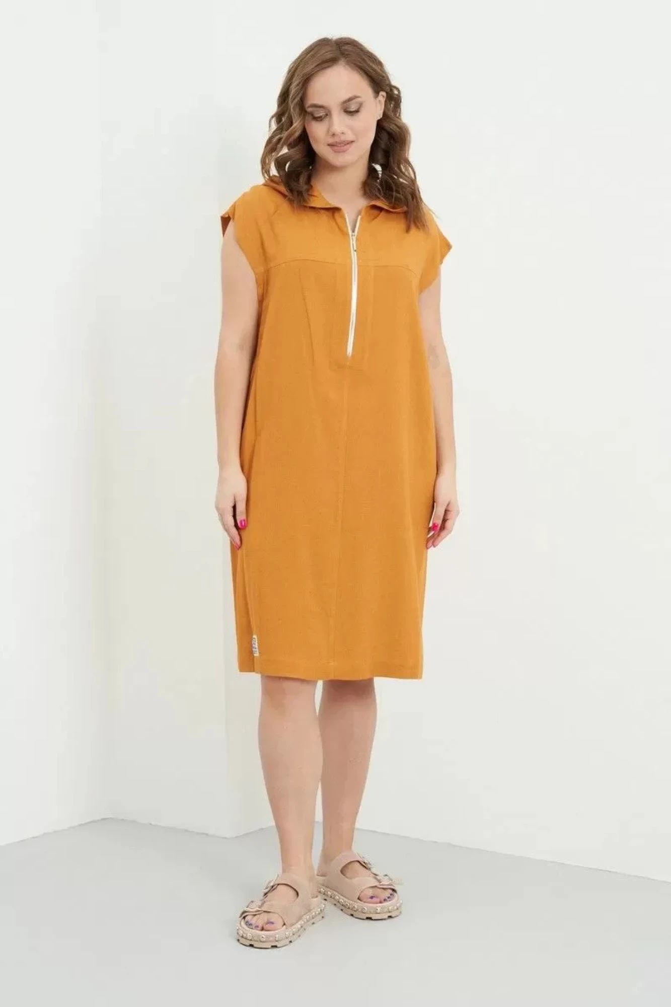 Женское платье из льняной однотонной ткани для повседневной носки. Платье прямого силуэта, со спущенной линией плеча, и проймой, переходящей в подрез треугольной формы. Перед лифа состоит из двух частей: горизонтальной кокетки с цельнокроенным капюшоном и нижней части. Застёжка на тесьму-молнию в центральном шве переда. Спинка платья состоит из двух частей: горизонтальной кокетки и нижней части, в среднем шве спинки обработана шлица. В боковых швах - карманы.Длина платья по среднему шву спинки около 99 см.