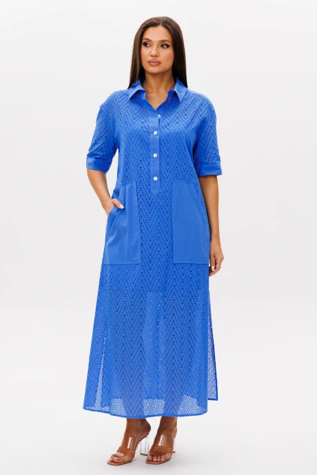 Платье свободного А-силуэта, рубашечного покроя с заниженной линией плеча, рубашечным воротником и рукавом.