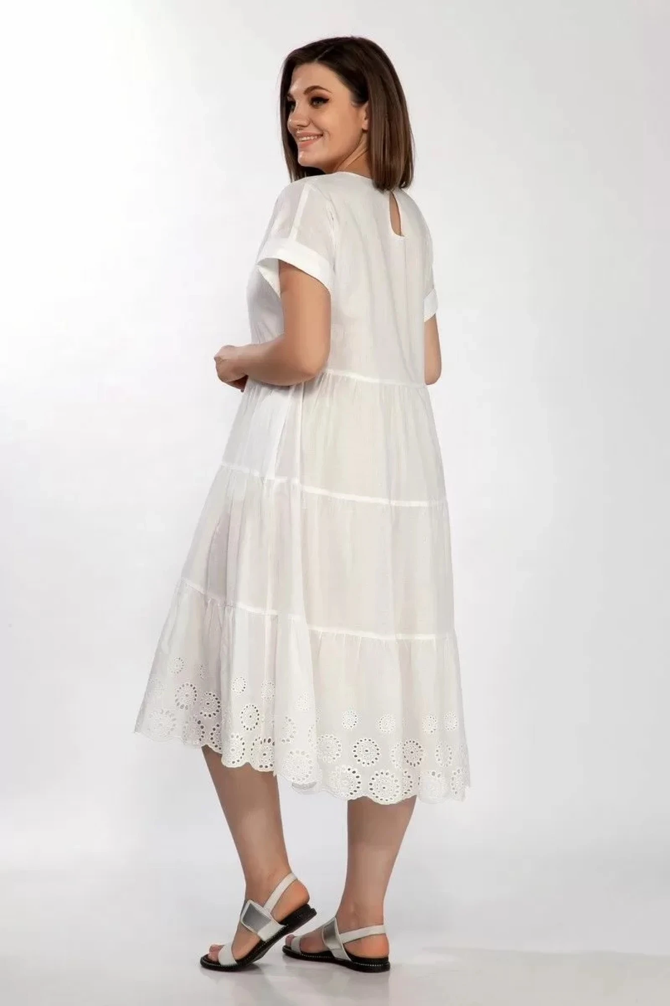 Стильное платье свободного силуэта из нежного хлопкового шитья на хлопковой подкладке с цельнокроеными рукавами и декоративной манжетой. Платье отрезное под грудью со сборкой и двумя воланами со сборкой. На спинке декоративная капелька. В боковых швах карманы.