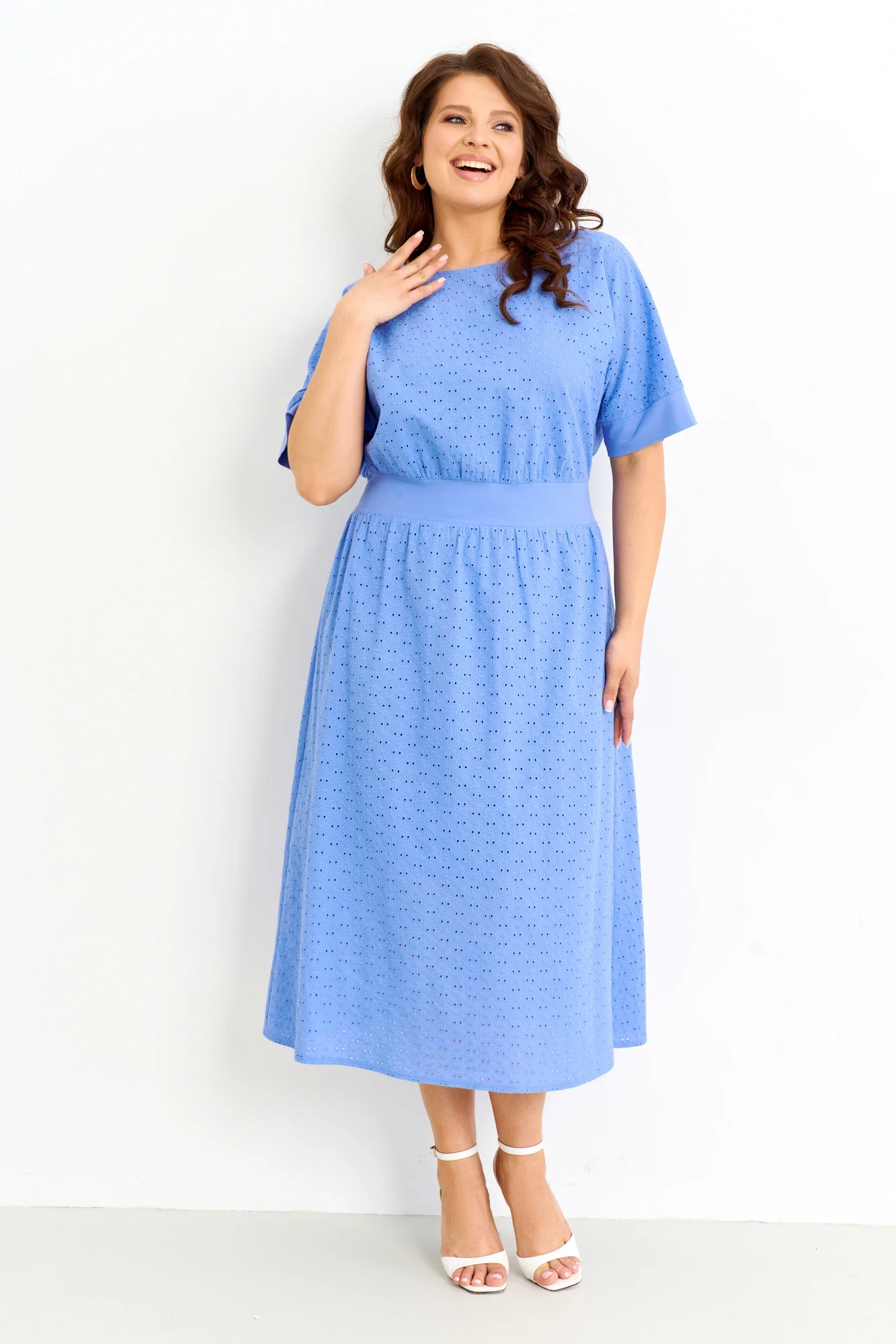 Женское платье свободного силуэта на подкладке выполнено из натуральной хлопковой ткани решелье. Платье с цельнокроеными рукавами, отрезное по линии талии, по спинке вставка из вискозы полностью на резинке, юбка платья на хлопковой подкладке, застежка по спинке на петлю и пуговицу. Платье полностью соответсвует заявленному размеру.