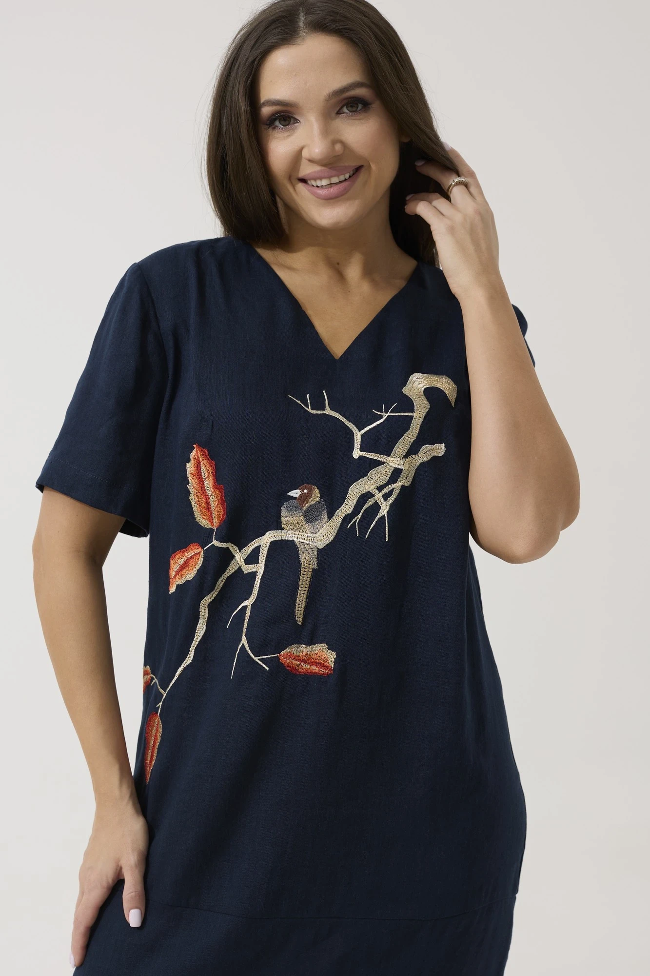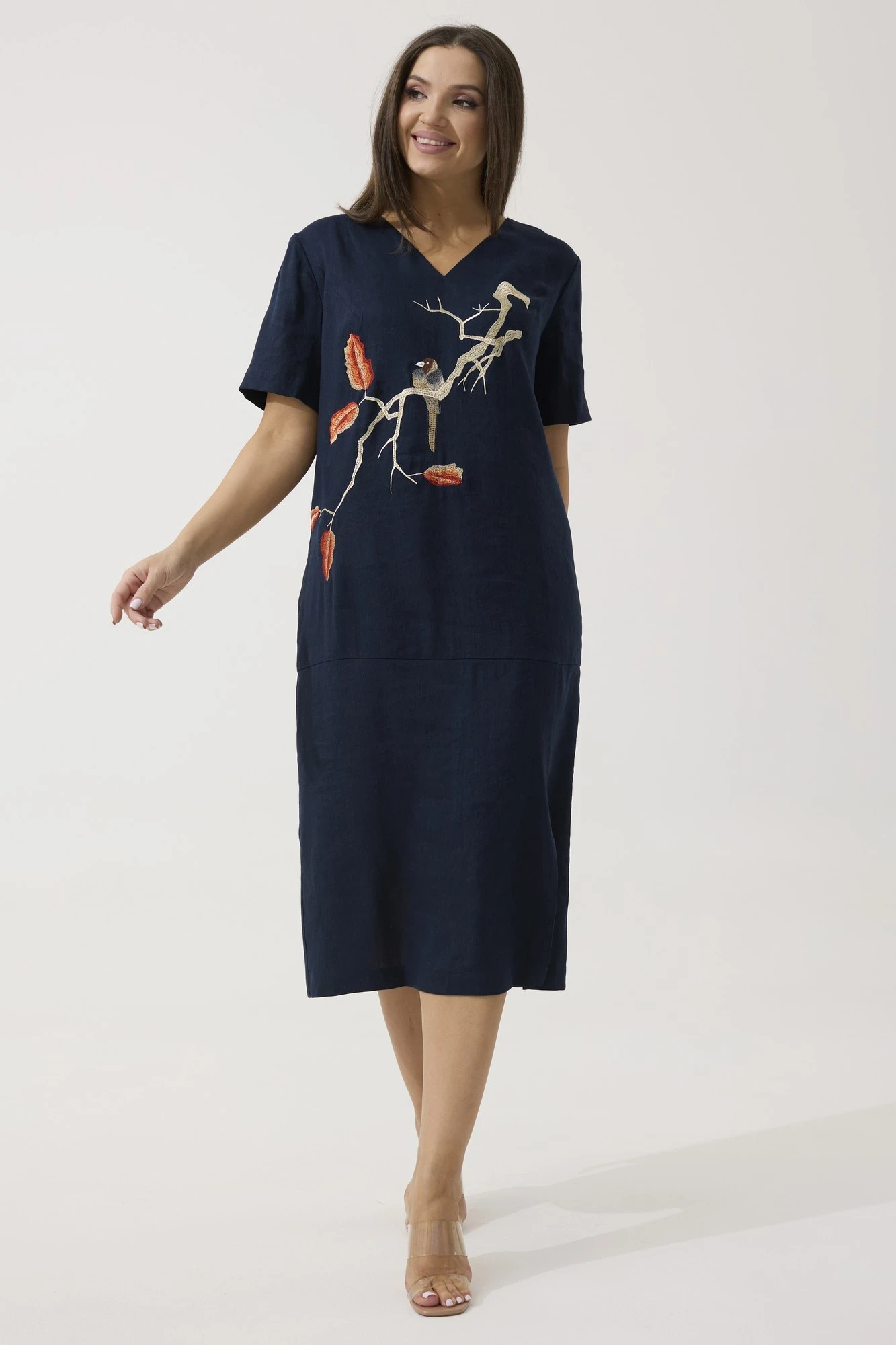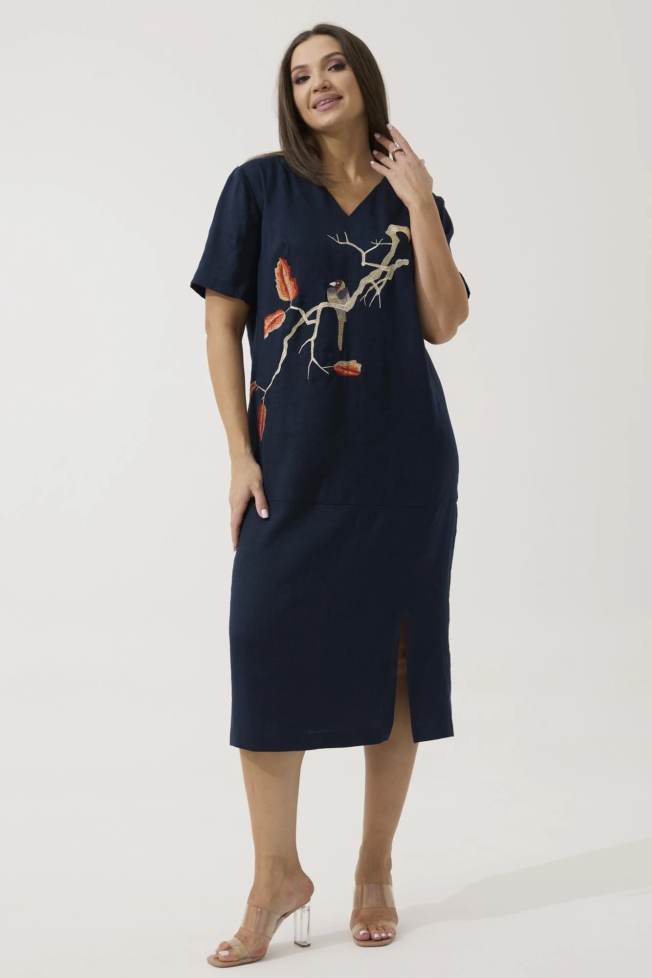 Нереально красивое платье! Натуральный дышащий, приятный телу материал глубокого синего цвета. Красочная, но не кричащая вышивка. Отличная посадка по фигуре, стройнит. Размер и рост соответствует заявленному.