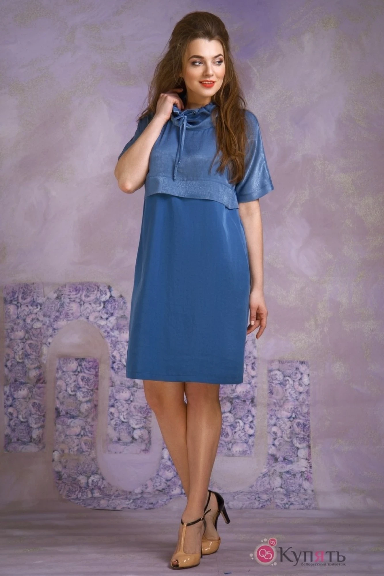 Элегантное женское платье выполнено из комбинации двух видов ткани. Лиф платья выполнен из ткани с блеском с цельнокроеным рукавом, заканчивающимся манжетом, горловина округлой формы с мягким воротником хомутом, который собирается с помощью кулисы. Низ платья чуть расширенный к низу, от подреза идут фигурные подрезы, в которых расположены карманы. Платье легкое, идеально подойдет для жаркой погоды.
