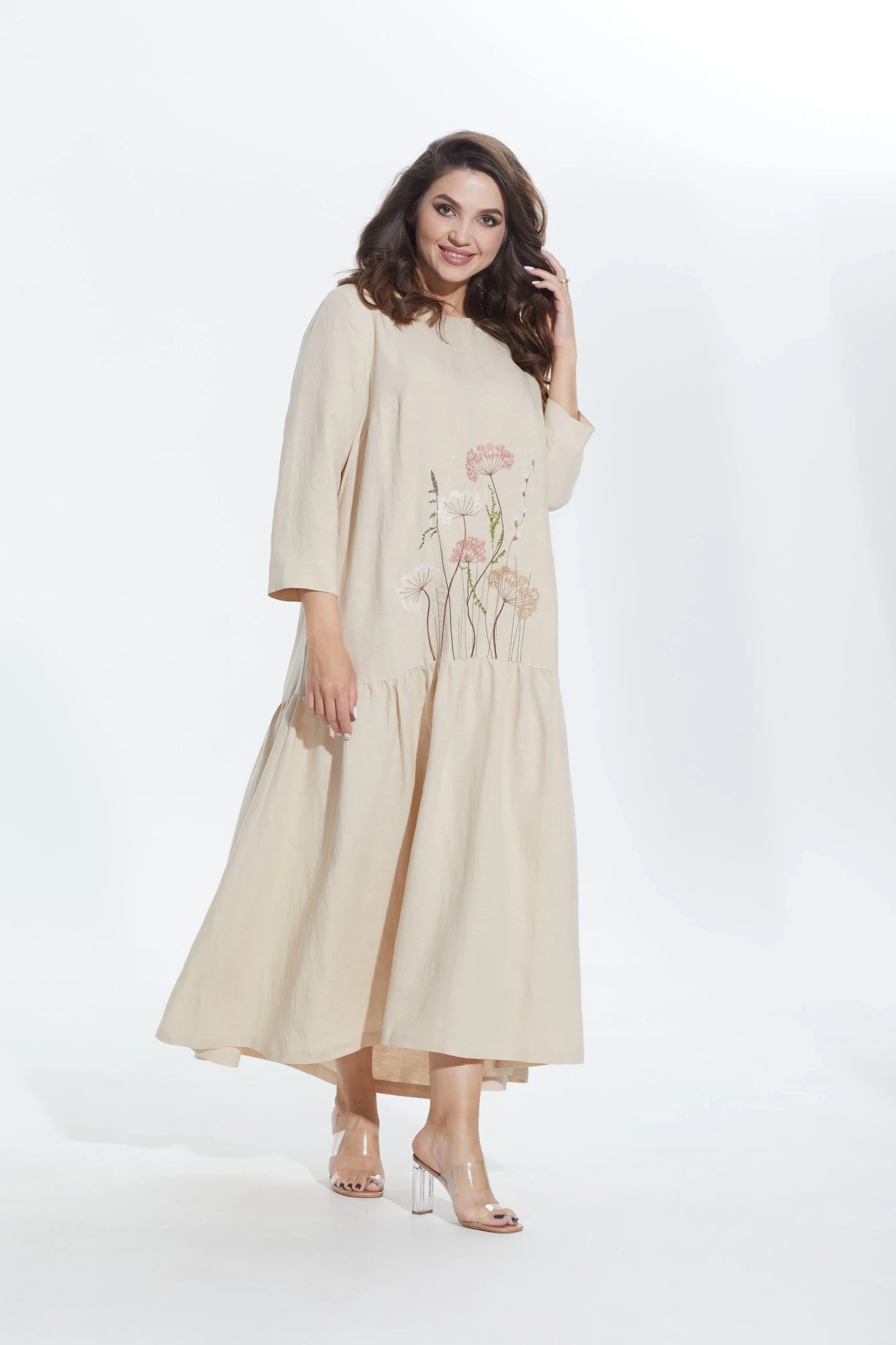 Платье в стиле оверсайз. Горловина округлой формы, слегка расширена. Платье с подрезом ниже линии бедер, нижняя часть со сборкой по кругу. Перед с нагрудными вытачками от боковых швов и вышивкой от подреза. В боковых швах карманы. Верхняя часть спинки со средним швом, вверху которого разрез, застегивающийся на 2 навесные петли и пуговицы. Рукав втачной одношовный, длиной 3/4