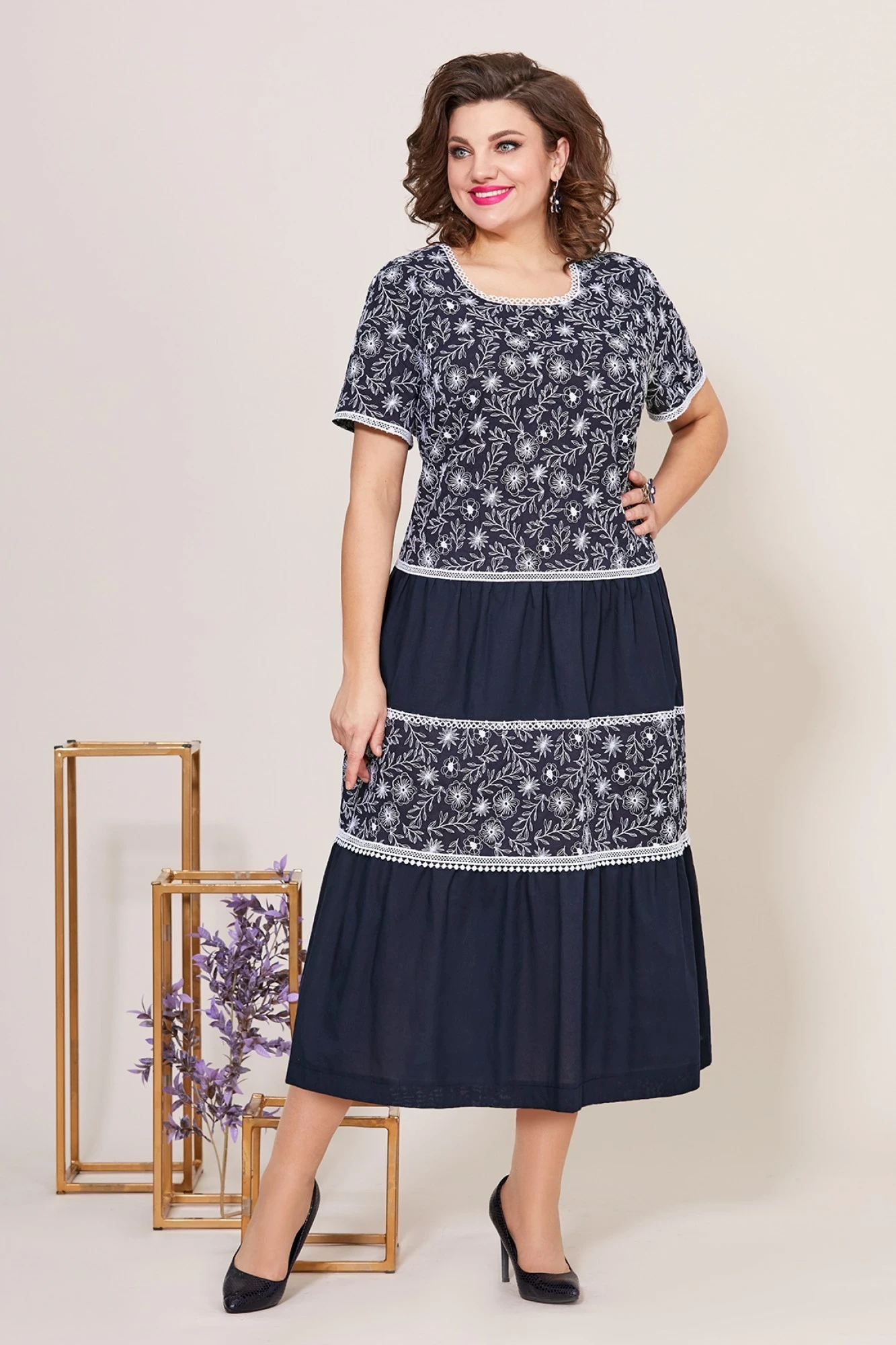 Легкое, летнее платье полу-прилегающего силуэта, выполнено из хлопка с вышивкой и однотонного хлопка. Горловина платья округлой формы, на обтачке, декорировано кружевом. По переднему полотнищу выполнены горизонтальные подрезы с декором в виде кружева и притачены воланы из однотона. Рукав втачной, укороченный, выполнен из хлопка с вышивкой. Спинка идентична полочке, в боковом шве потайная молния. Эффектное, стильное платье для жаркого лета!