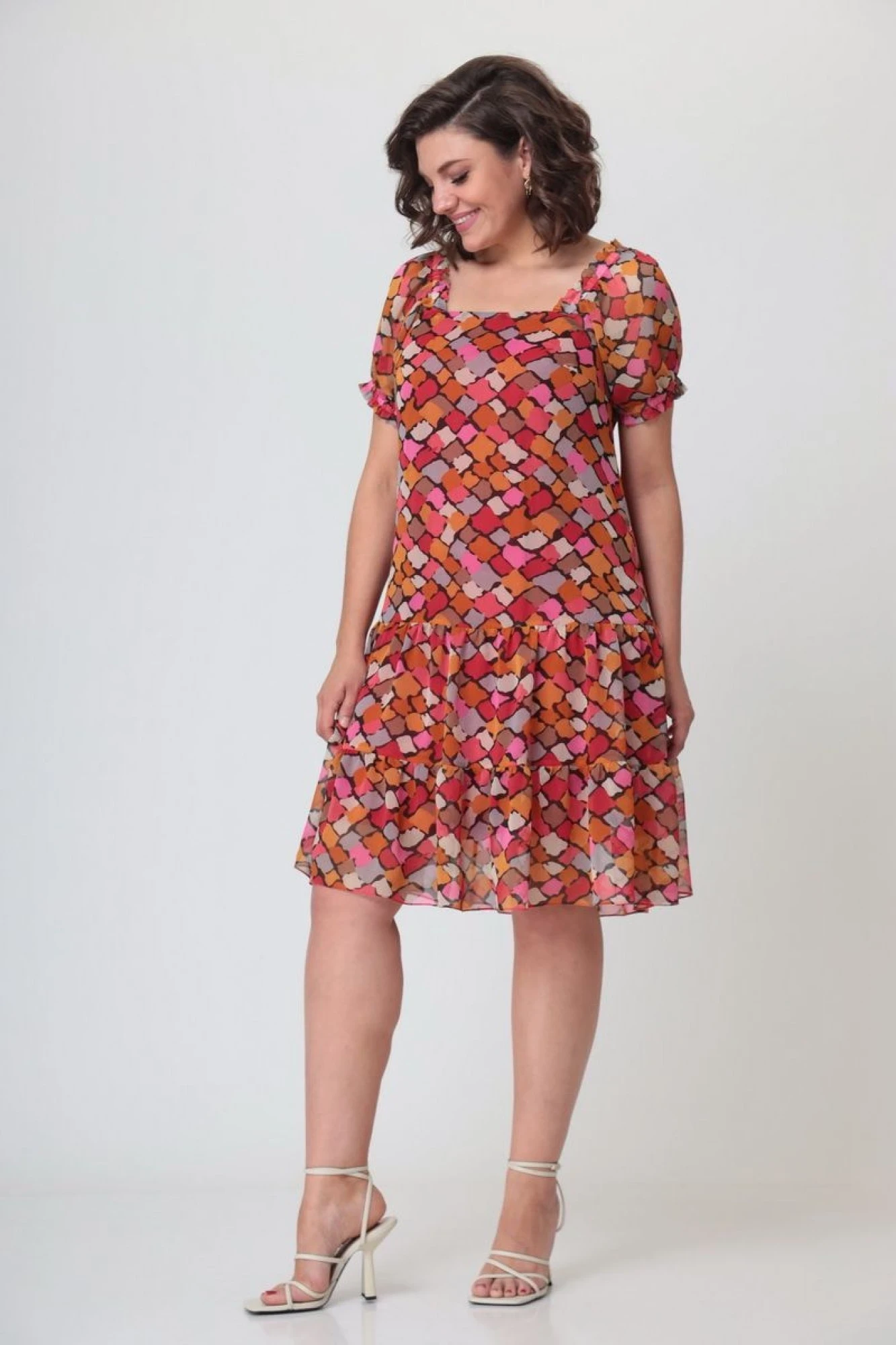 Платье женское полуприлегающего силуэта, расширенное к низу за счет воланов. Выполнено из шифона на трикотажной подкладке. Платье состоит из переда, спинки, верхнего волана переда и спинки, нижнего волана переда и спинки, рукавов. Горловина в виде “карэ”. Верхний срез рукава присобран на тесьму, нижний срез рукава присобран на резинку. Рукав в форме фонарика.