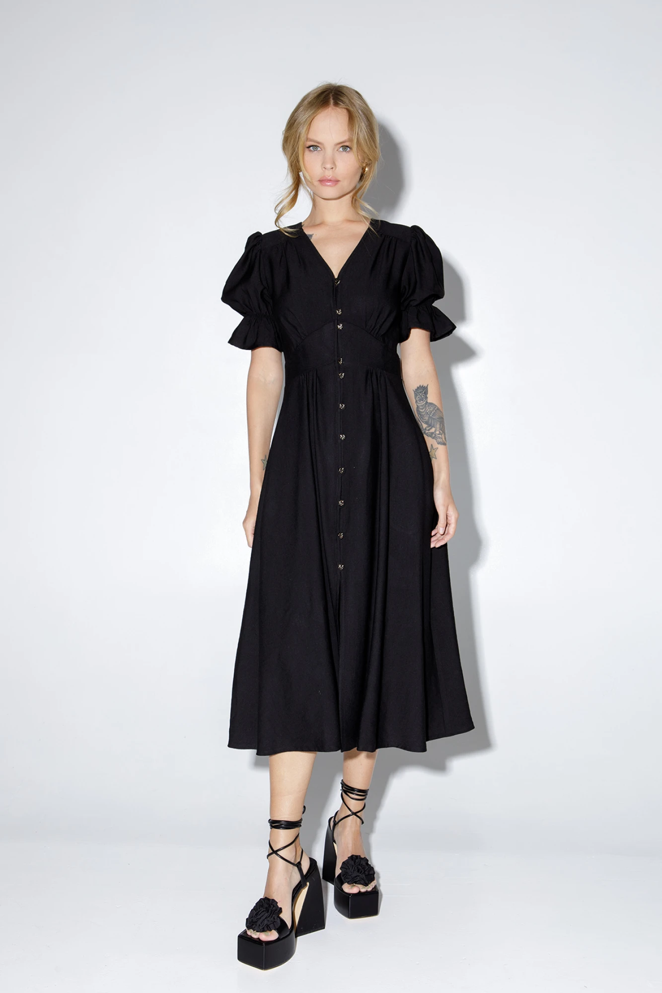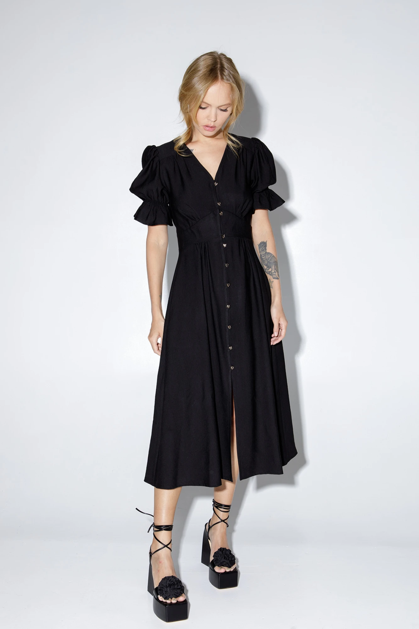 Миди-платье приталенного силуэта из вискозы. Детали: V-образный вырез, отрезная линия талии, перед и спинка с кокетками, застёжка на навесные петли и декоративные пуговицы, короткие пышные рукава, спинка с резинкой, боковые карманы в швах. Длина платья по спинке около 116 см