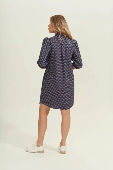 Платье прямого силуэта с центральной застежкой на петли и пуговицы с цельнокроеной планкой и рубашечным воротником с отрезной стойкой. Перед с нагрудными вытачками и настрочным клапаном в районе груди. Спинка с отрезной кокеткой и встречной складкой. Рукав втачной со сборкой по окату. Низ рукава собран на резинку. Низ платья фигурный. Платье дополнено поясом из основной ткани. Фурнитура может быть изменена с сохранением художественного образа. Длина платья - 94 см, длина рукава -  47 см.