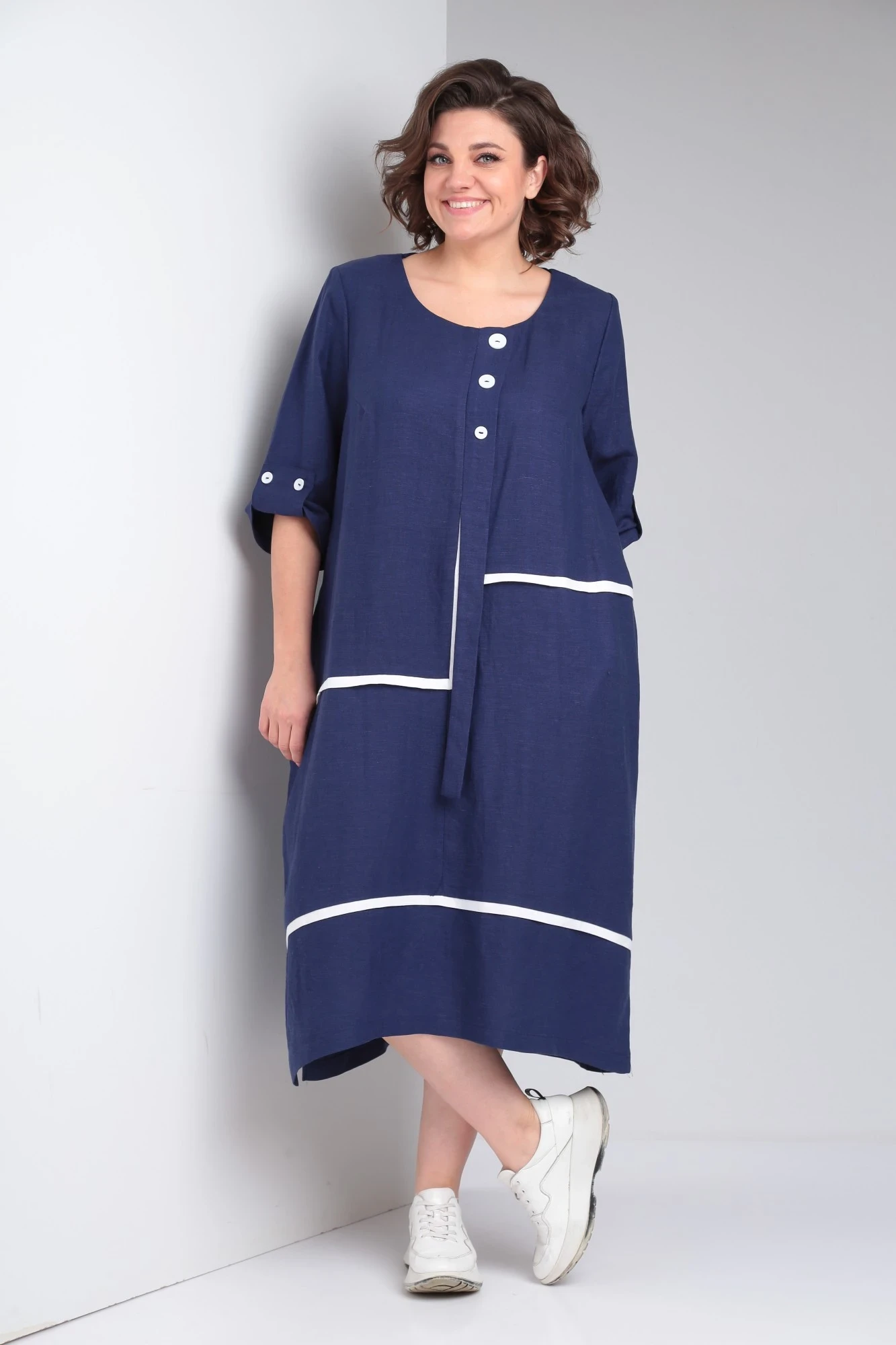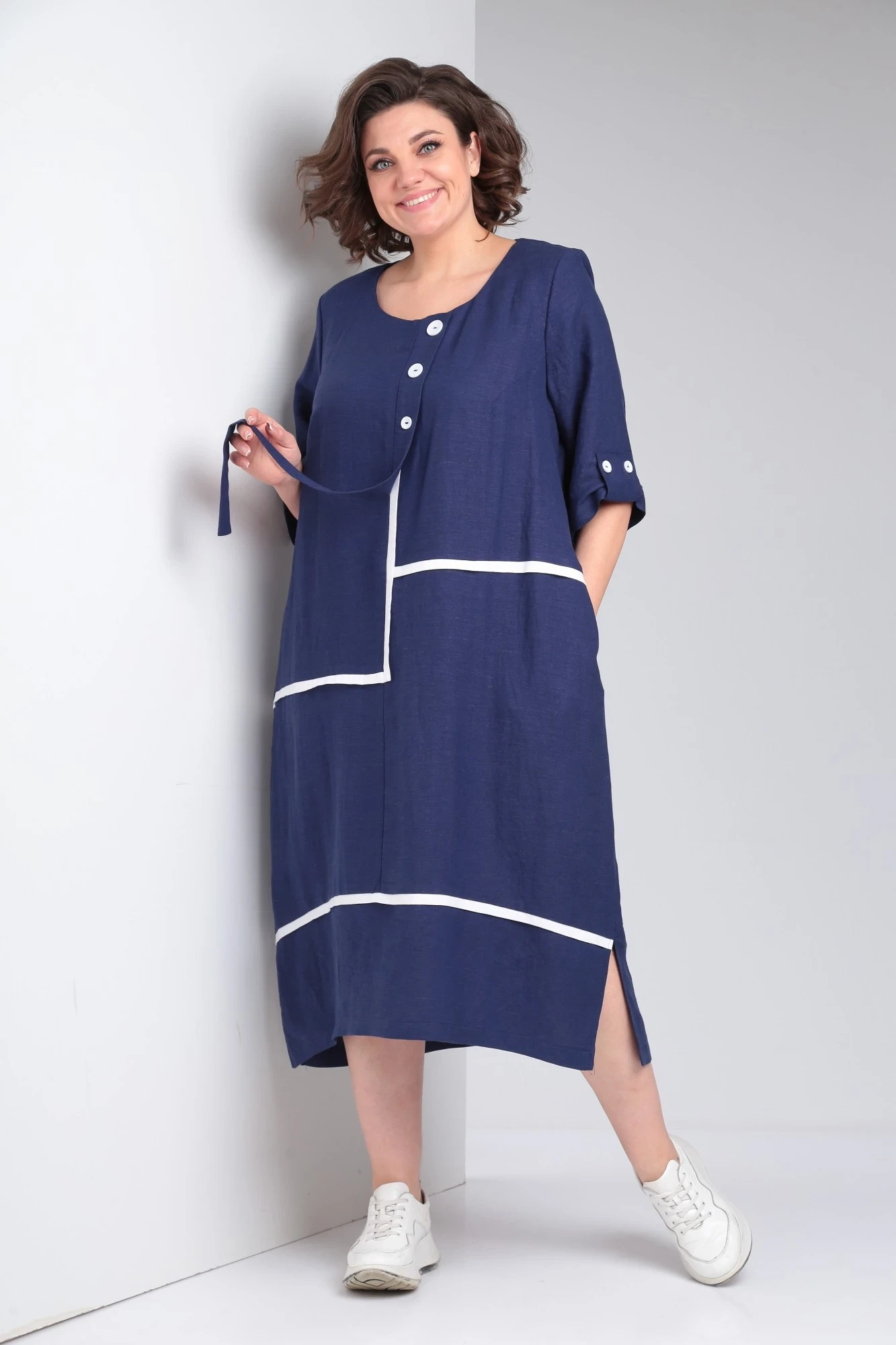 Льняное платье в стиле "бохо" в длине миди, подойдёт как для деловых встреч, так и для любых торжеств. Его чёткие и строгие линии белого канта придаёт этому платью привлекательность, а свободный крой, позволит чувствовать комфорт и скрыть изъяны фигуры.
