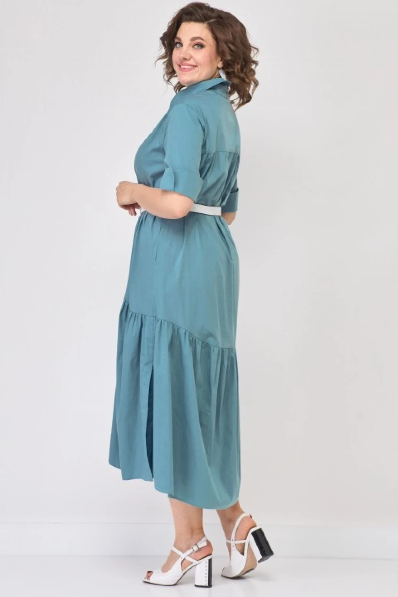 Платье- халат в стиле бохо для современных женщин свободного кроя. По низу изделия идет широкий волан, по переду планка с застежкой на пуговицах. Планка украшена тесьмой. Воротник рубашечного типа на стойке. Рукав втачной с широкой манжетой. Длина регулируется за счет манжеты. Низ изделия ассиметричный, чуть длиннее сзади. Платье можно носить с ремешком, можно без ( в комплект не входит, цена указана без стоимости ремешка)