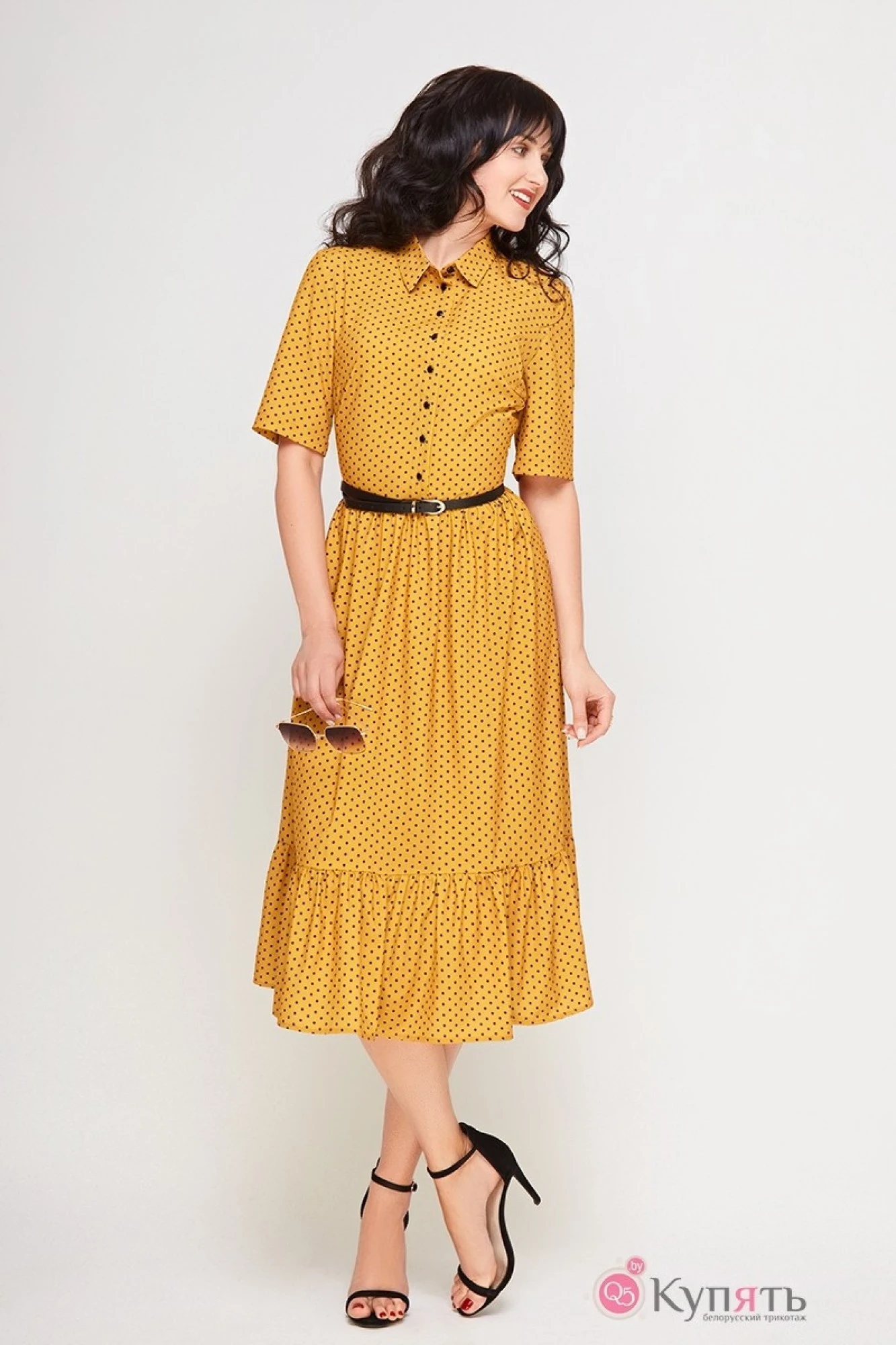 Платье женское, полуприлегающего силуэта. Ткань текстиль. Ткань эластичная. Основной цвет горчичный в синий горошек. По лифу платья по переду нагрудная вытачка, застёжка на петли и пуговицы. Спинка цельная, по линии талии вытачки. Рукав втачной, одношовный. Юбка отрезная по линии талии. По линии талии юбки сборка. Горловина обработана притачным воротником со стойкой, застёгивается на одну петлю и пуговицу. По низу юбки платья волан. Ширина волана 22 см. В левом боковом шве потайная молния.В комплекте съёмный пояс. Дизайн пояса в зависимости от партии может меняться.