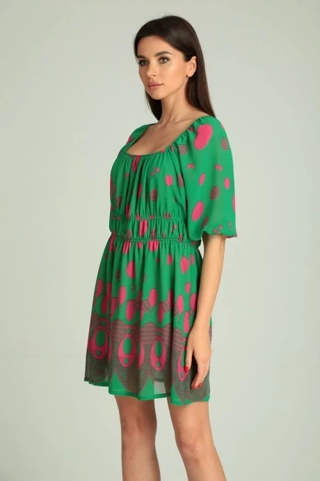 Платье из шифона на подкладке, свободного силуэта, отрезное и собранное на резинку по линии талии, расширенное к низу. Рукав реглан, собран на резинку. Вырез горловины круглый, собран на резинку.