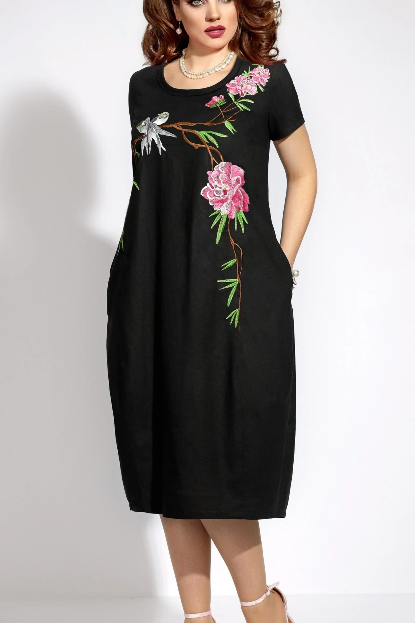 Платье женское свободного кроя с нагрудными вытачками по переду и средним швом по спинке. В нижней части платья по переду и спинке имеются декоративные вытачки. Горловина круглой формы, обработана обтачкой с открытым вытрепанным срезом. В верхней части полочки имеется декор - вышивка. Рукав втаной одношовный.