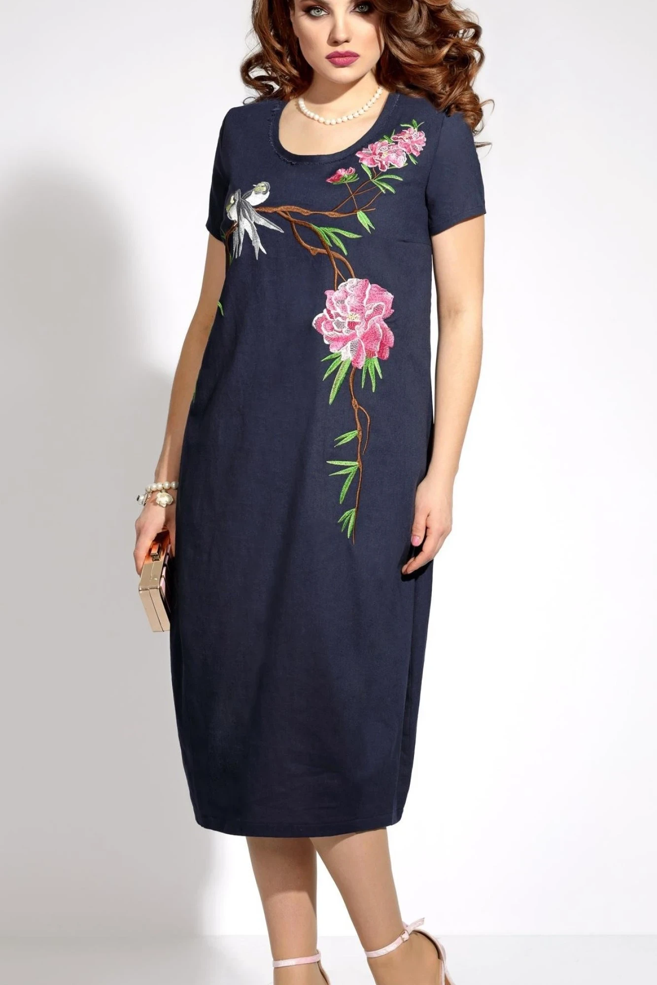 Платье женское свободного кроя с нагрудными вытачками по переду и средним швом по спинке. В нижней части платья по переду и спинке имеются декоративные вытачки. Горловина круглой формы, обработана обтачкой с открытым вытрепанным срезом. В верхней части полочки имеется декор - вышивка. Рукав втаной одношовный.
