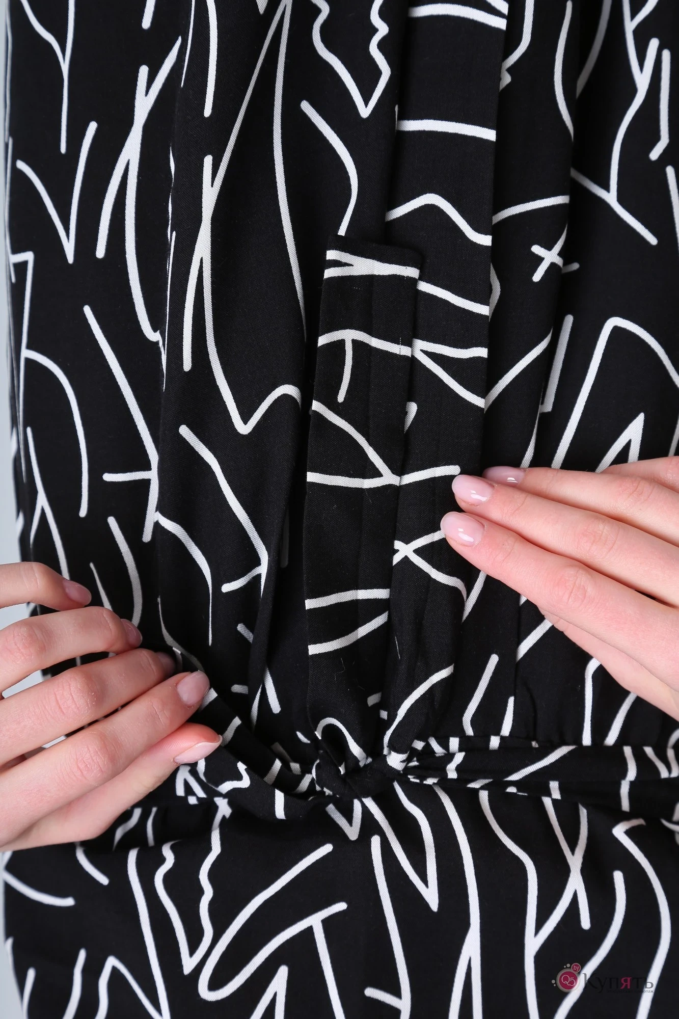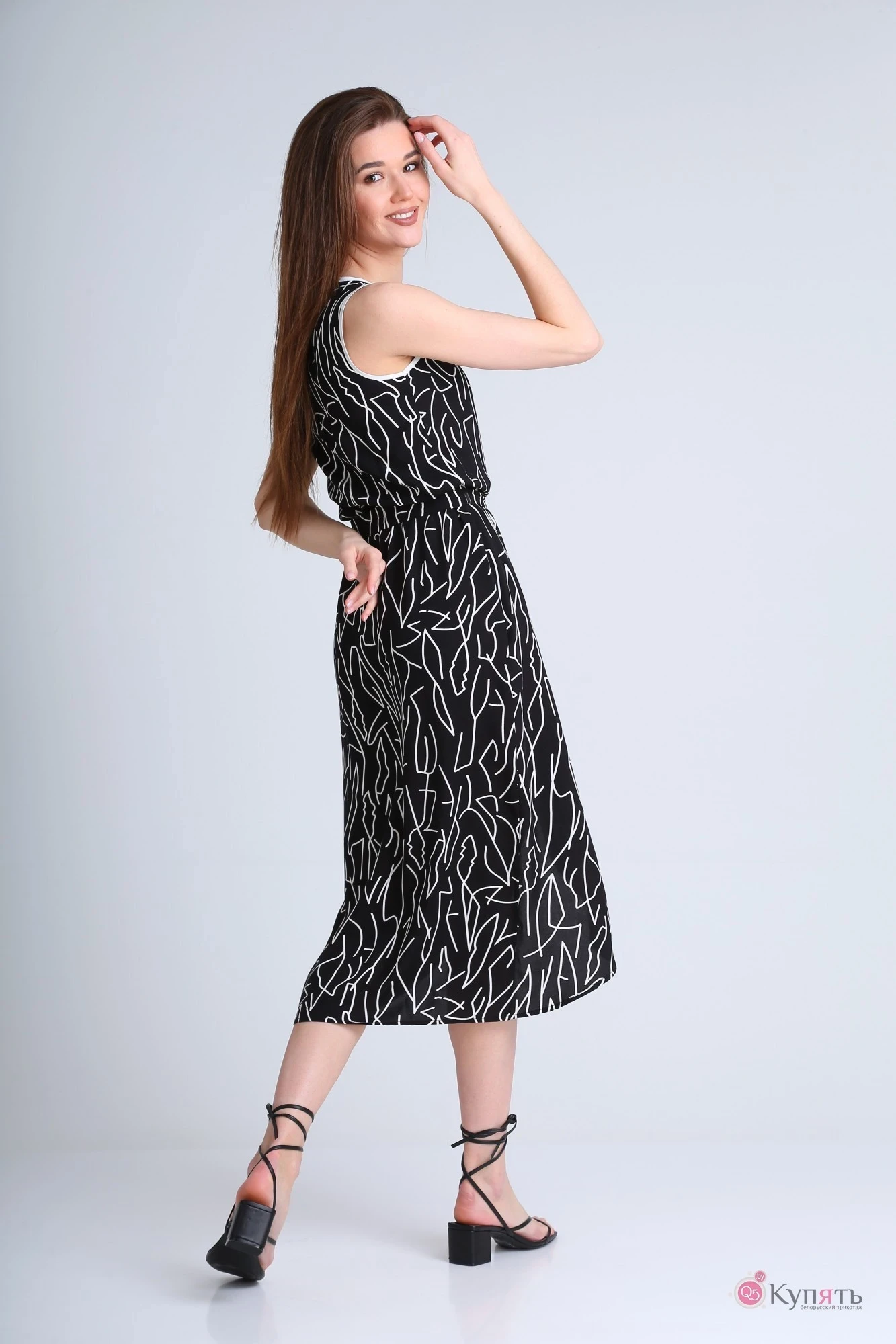 Платье женское с запахом в юбочной части. Горловина и пройма окантованы отделочной тесьмой. По линии талии на переднем полотнище две мягкие складки. Без рукавов. Пояс в комплекте. Длина изделия 127 см (для роста 164 см)/ 130см (для роста 170 см).
