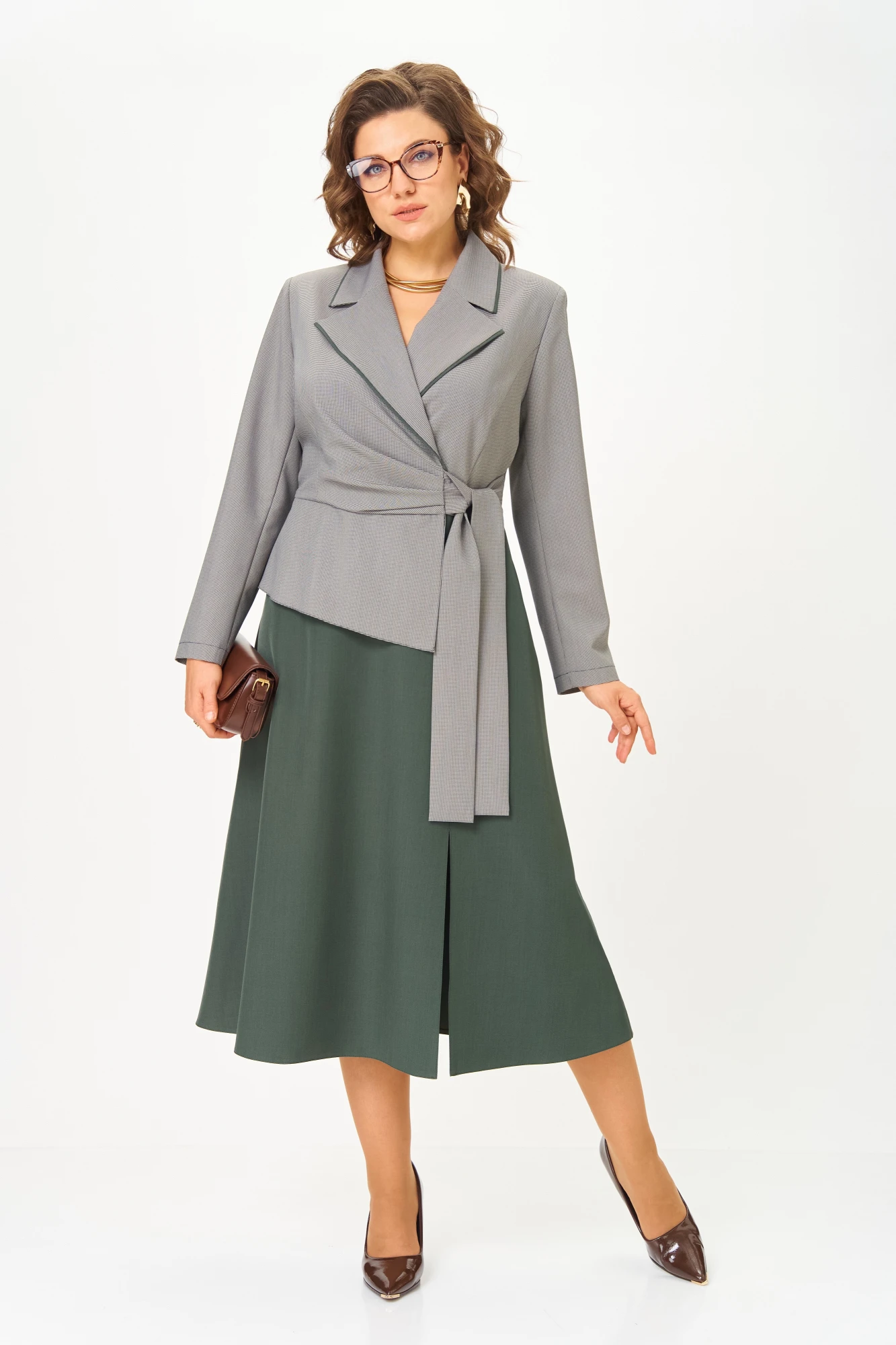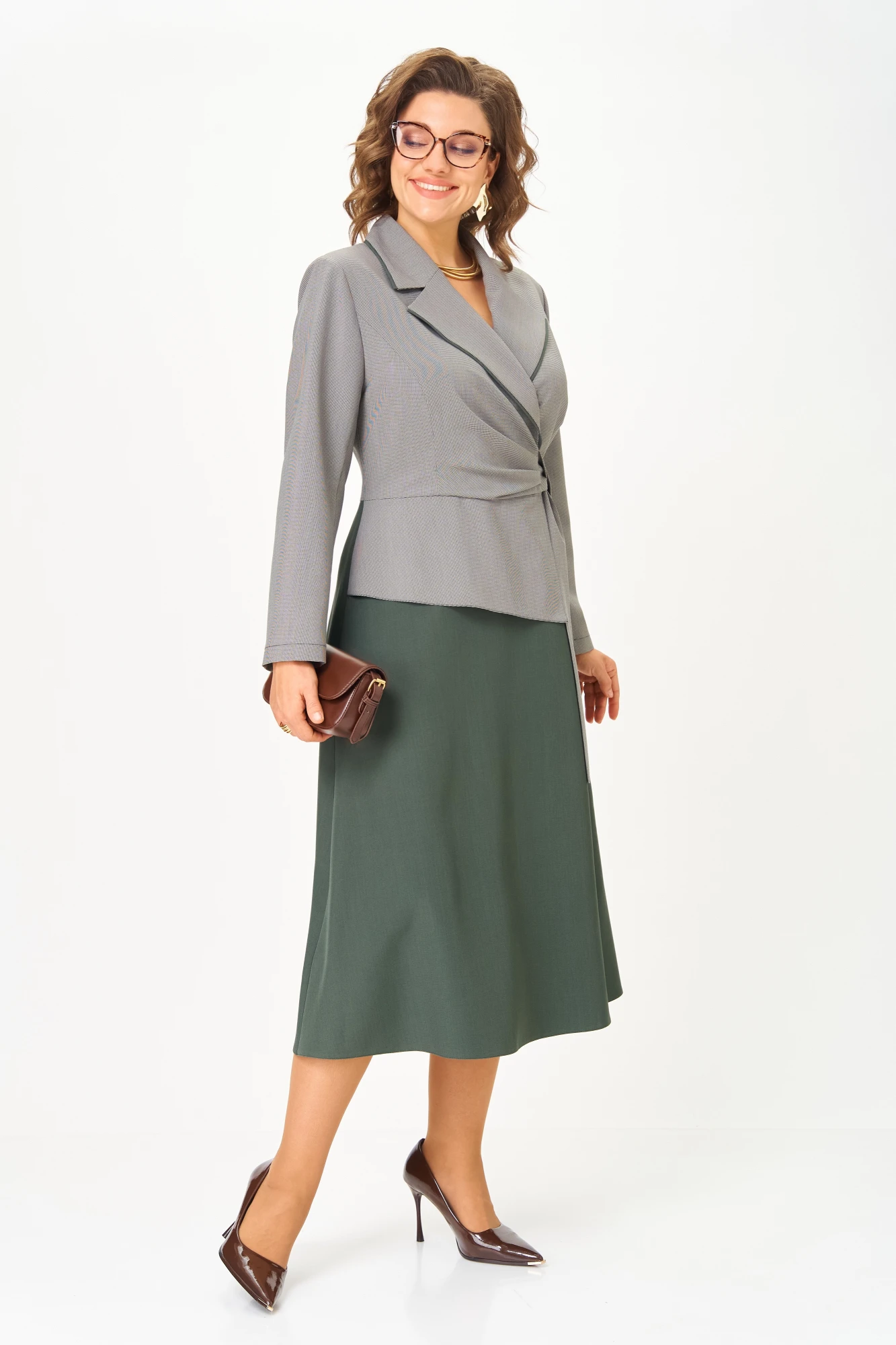 Платье построено на контрасте текстур и цветов: холодная серая «гусиная лапка» + глубокий тёмно-зелёный оттенок хвои. Асимметрия с запахом верхней части платья и разрез на юбке вытягивают силуэт, делают образ динамичным и современным. Зелёная окантовка лацканов и пояс выступают связующим элементом между верхом и низом, создавая цельный и очень дорогой вид. Образ выглядит дорого, интеллигентно и слегка провокационно.