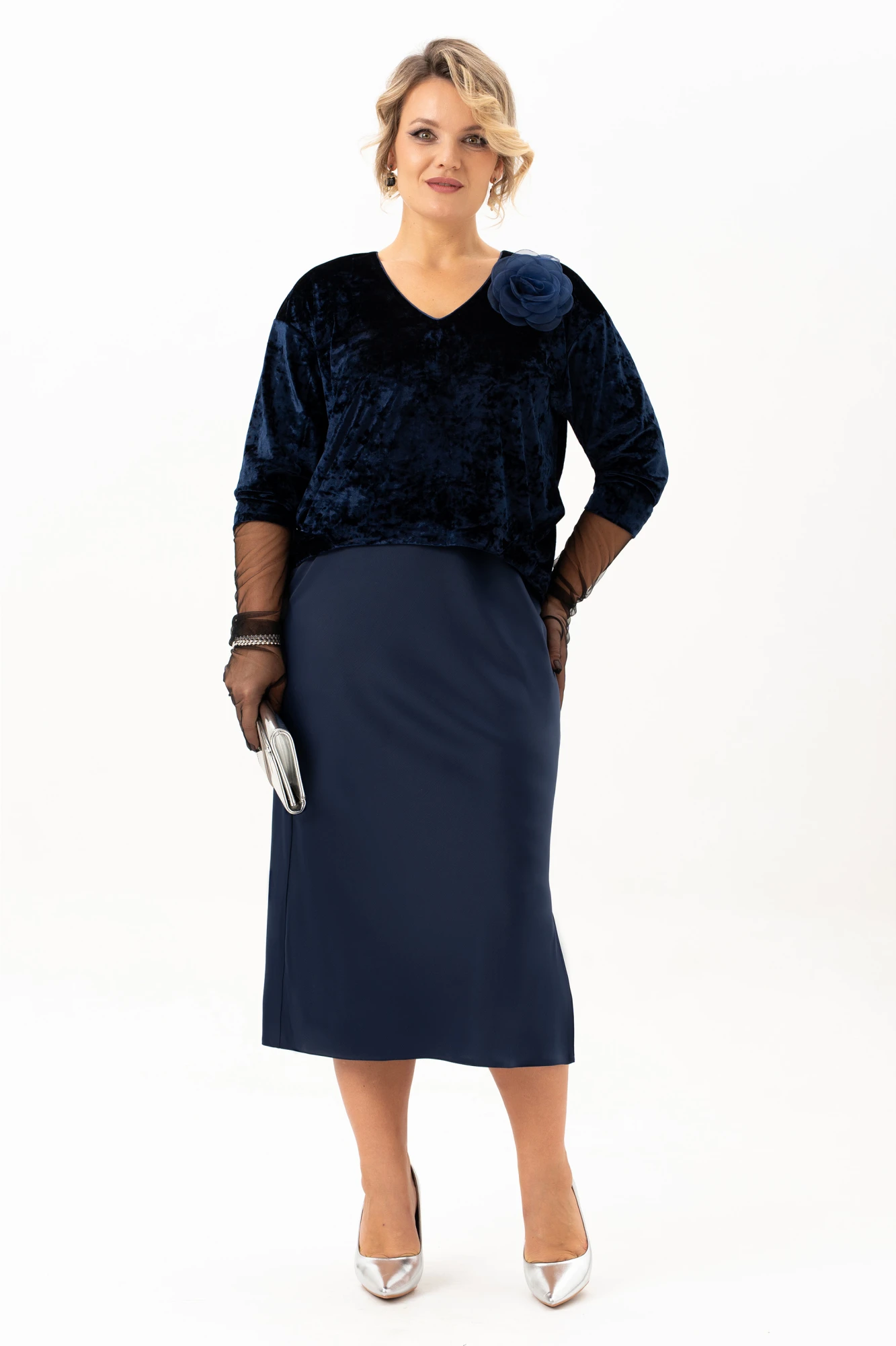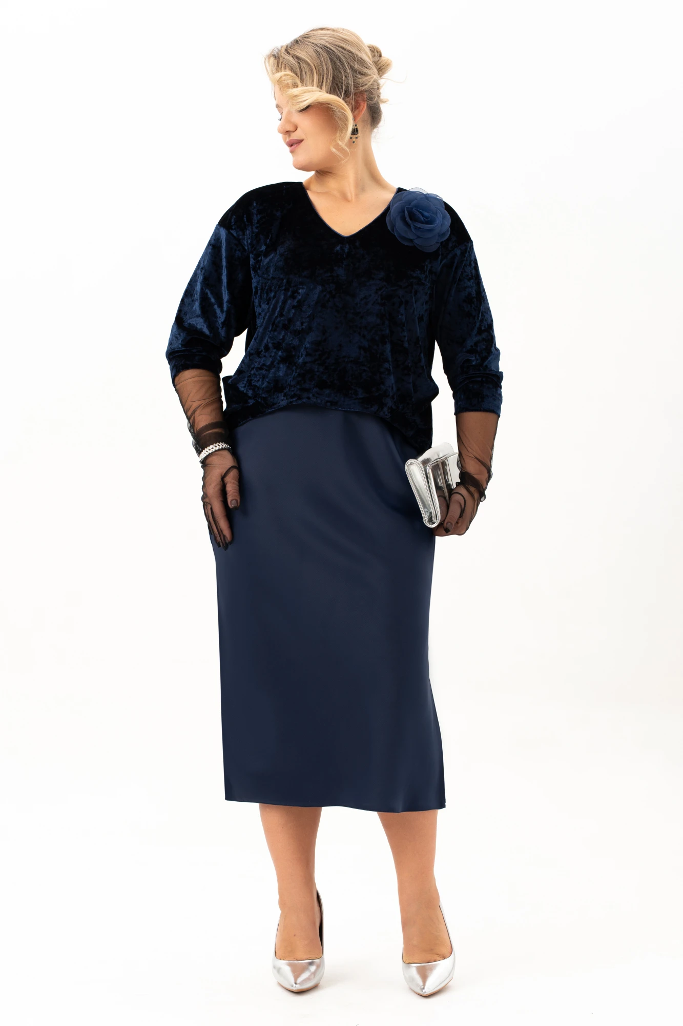 Окунитесь в мир роскоши и элегантности с бархатным вечерним платьем О-образного силуэта имитации костюма. Эта модель, словно сошедшая со страниц модного журнала , станет идеальным выбором для любого праздничного события. Мягкий бархат струится по фигуре, подчеркивая ее изгибы и создавая неповторимый образ. V-образный вырез горловины придает образу женственность и нежность, а атлас по низу платья добавляет нотку изысканности. Длина миди делает это платье универсальным, подходящим как для торжественных мероприятий, так и для романтических свиданий. Представьте себя в этом платье на новогодней вечеринке, на свадьбе лучшей подруги или на любом другом празднике – вы будете неотразимы! Кант по горловине изделия , съемный бант и удлиненные перчатки из эластичной сетки добавляют изюминку, делая образ еще более привлекательным. Платье на трикотажной подкладке выполнено из ткани которая обеспечивает комфорт и свободу движений на протяжении всего вечера. Благодаря отрезному под грудью силуэту, модель идеально садится на фигуру, подчеркивая все ее достоинства.