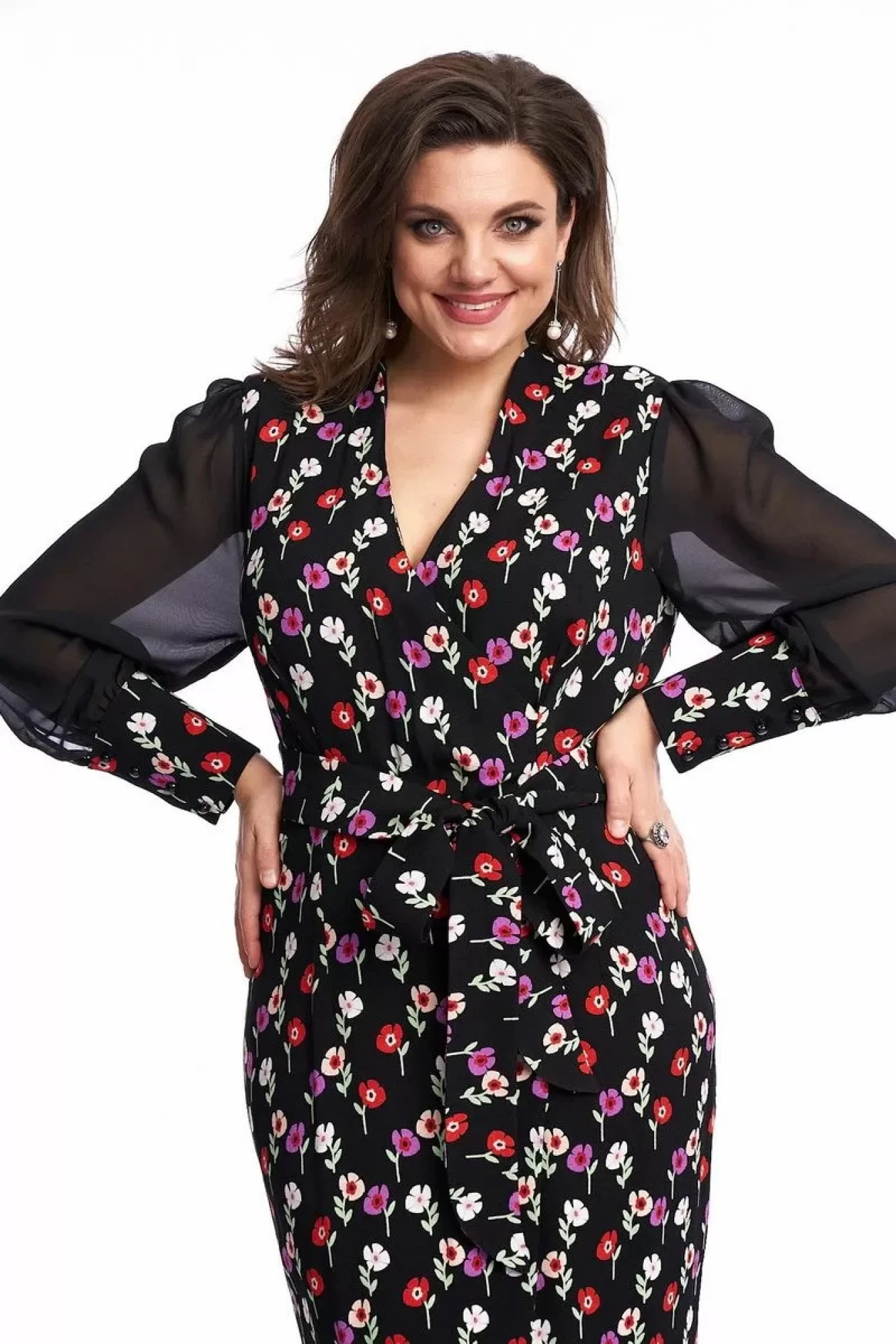 Платье женское, очаровательное, романтичное, выполненное из ткани с ярким принтом, приталенного силуэта. Перед отрезной по линии талии. Верхняя и нижняя части переда с запахом, входящим в талиевые вытачки. Спинка со средним швом, внизу которого шлица, а также талиевые вытачки. Воротник – цельнокроеная стойка с V-образным вырезом горловины, переходящим в запах верхней части переда. Рукав втачной одношовный, снизу на высокой манжете из основной ткани, застегивающейся на 4 петли-пуговицы. Застёжка в левом боковом шве на потайную тесьму-молнию. В качестве декора используется съёмный пояс. Платье может быть нарядным, а также использоваться для работы в офисе и школах, удобное, подчёркивает достоинства фигуры, не сковывает движение.