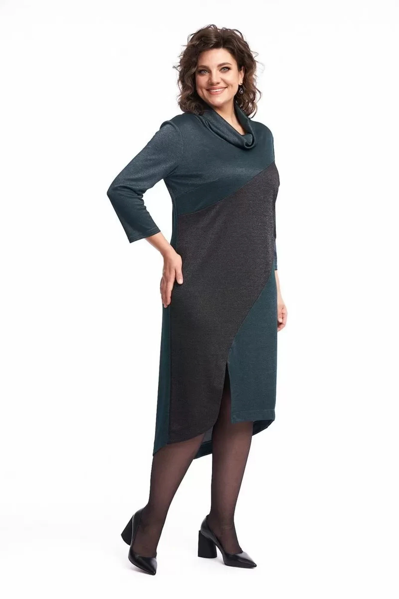 Платье женское, полуприлегающего силуэта, расклешенное к низу, выполнено из трикотажного полотна в двух контрастных цветах. По переду расположены нагрудные вытачки, а также по переду расположена притачная, ассиметричная, декоративная деталь, которая справа заканчиватся разрезом с закруглением. Спинка со средним швом. Длина переда платья короче спинки. Рукав втачной, одношовный, длиной ¾. Воротник – хомутик. Платье может быть нарядным, а также использоваться для работы в офисе и школах, удобное, силуэт скрывает недостатки и подчёркивает достоинства фигуры, не сковывает движение.