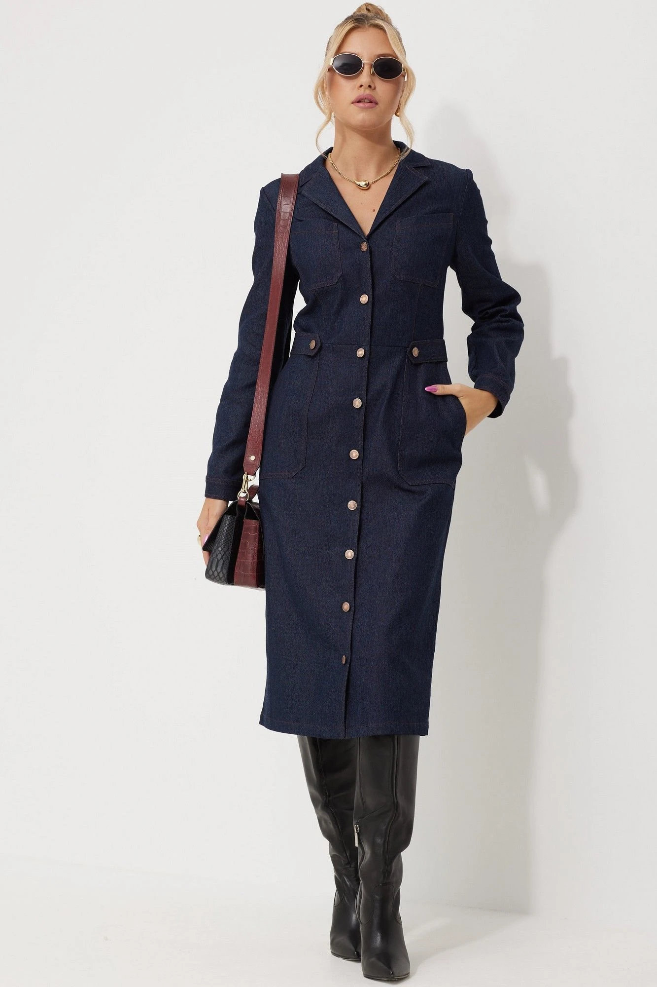 Платье женское полуприлегающего силуэта слегка зауженное к низу. Платье представлено из двух видов ткани из джинса на хлопковой основе и благородного замша. Застежка центральная на петли и пуговицы, воротник пиджачного типа. Платье отрезное по линии талии. На лифе полочки настрочены фигурные накладные карманы, на лифе и юбке обработаны талевые выточки, по юбке обработаны боковые накладные карманы. По спинке лифа обработана кокетка, также обработаны талевые выточки для более идеальной посадки. По линии талии по бокам паты, застёгивающиеся на петли и пуговицы. Рукава длинные втачные по низу притачная манжета на петлю и пуговицу