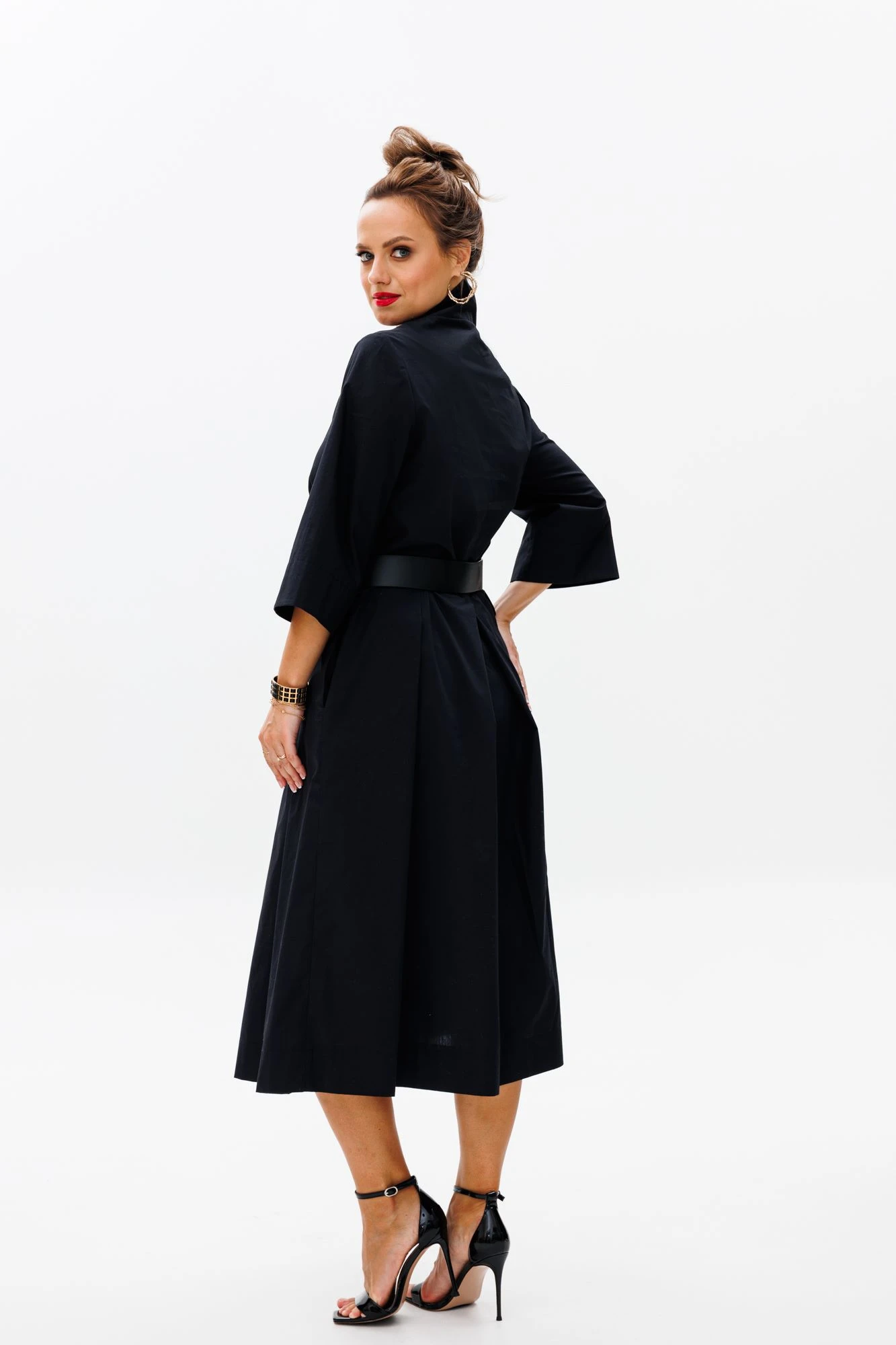 Шикарное черное платье с поясом ремнем. Идеально на любую погоду: под босоноржки либо под сапоги и пальто. Отличный вариант универсального изделия: подойдет как для повседневного и офисного гардероба, так и для праздничного выхода. Отрезное по линии талии. По полочке объем груди создается за счет направленных складок из подреза. Объем юбки создается за счет центральной встречной и 2-х односторонних складок. По бокам в юбке- карманы. Рукав втачной, 3/4 длинны с отворотом. Вырез горловины лодочка с отложным воротником. В комплекте съемный пояс. Длина спинки до подреза -45 см., длина юбки -77см. Длина рукава-44 см.