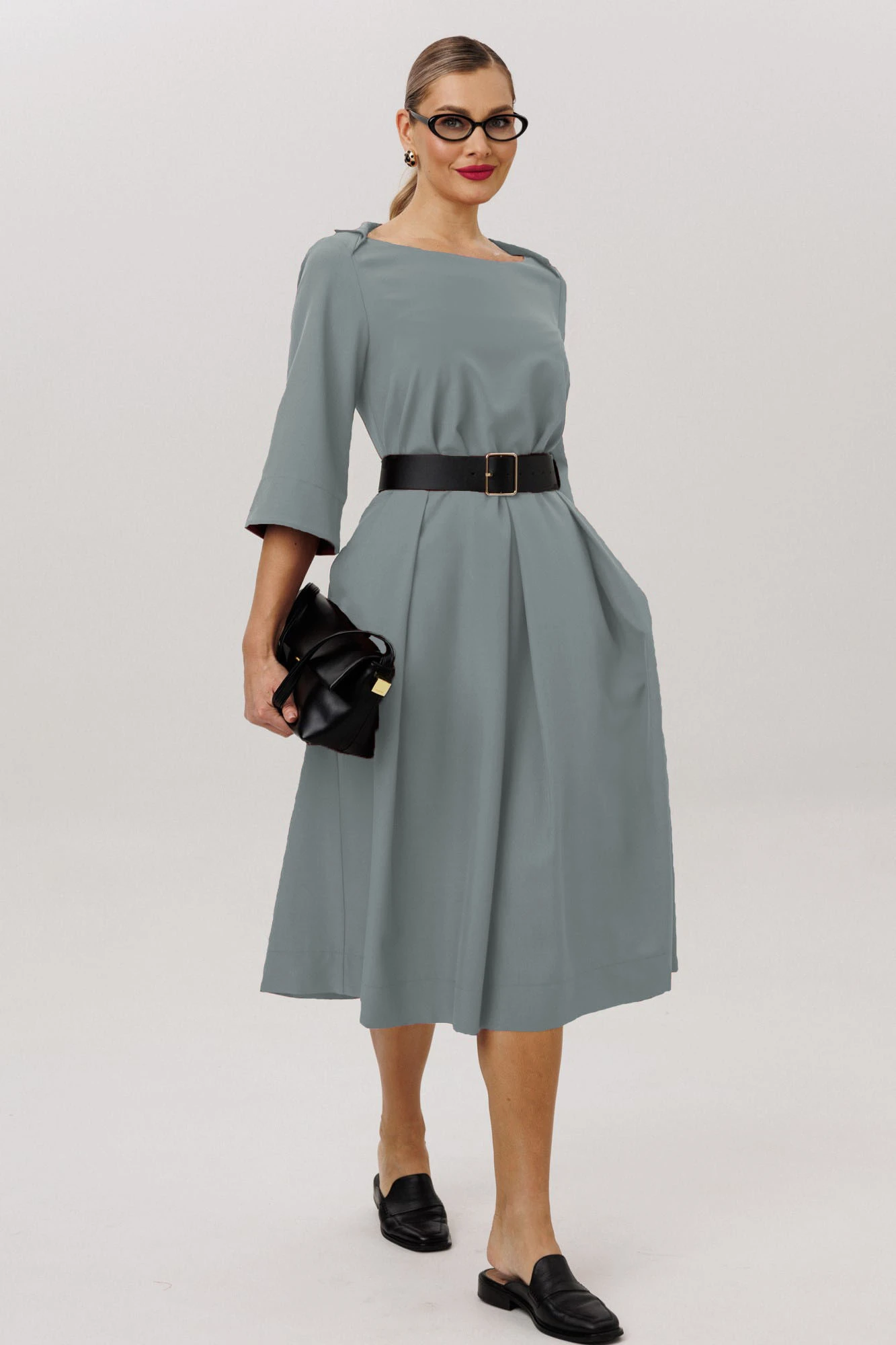 Шикарное платье с поясом ремнем. Отличный вариант универсального изделия: подойдет как для повседневного и офисного гардероба, так и для праздничного выхода. Отрезное по линии талии. По полочке объем груди создается за счет направленных складок из подреза. Объем юбки создается за счет центральной встречной и 2-х односторонних складок. По бокам в юбке- карманы. Рукав втачной, 3/4 длинны с отворотом. Вырез горловины лодочка с отложным воротником. В комплекте съемный пояс. Длина спинки до подреза -45 см., длина юбки -77см. Длина рукава-44 см.
