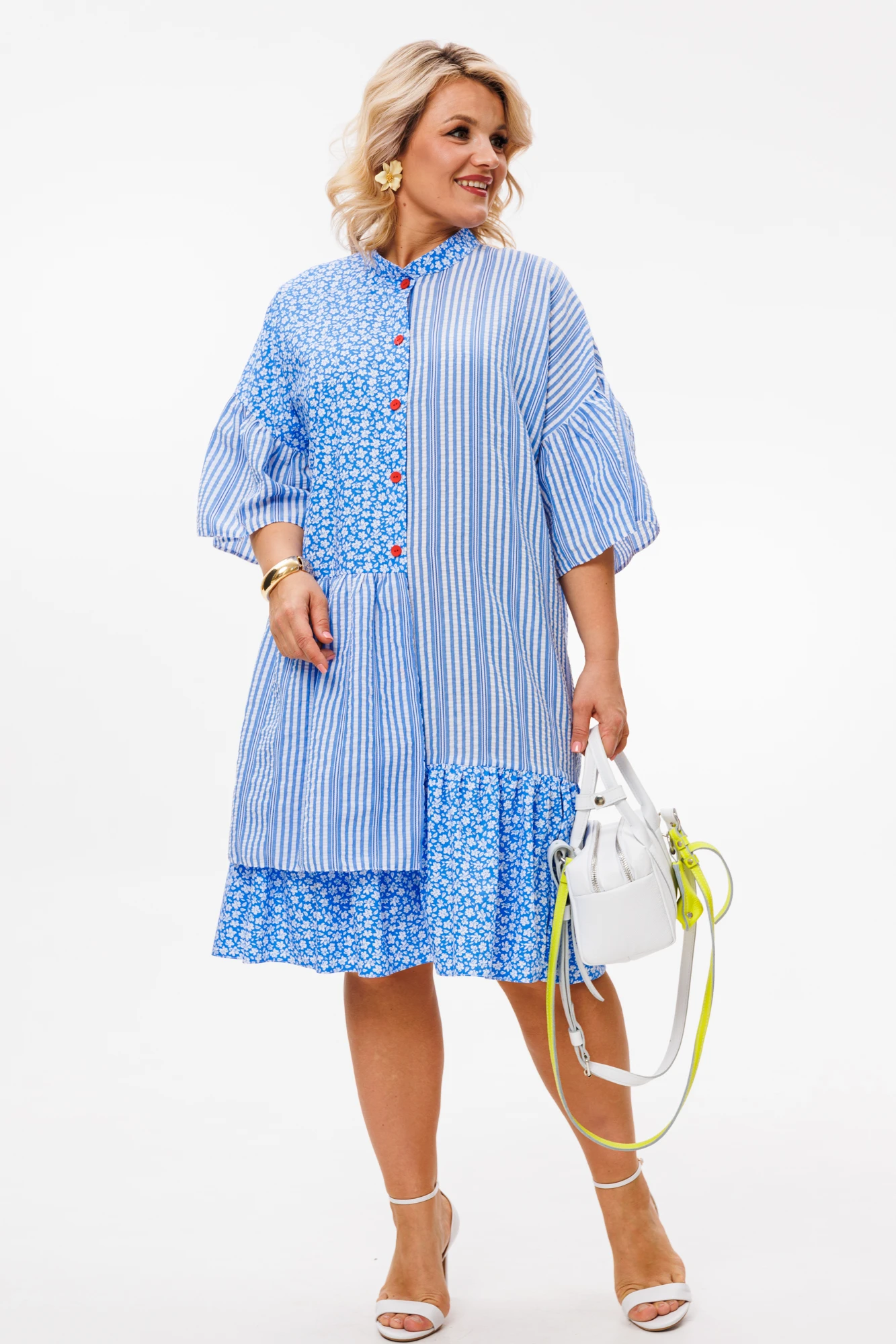 Оригинальное женское платье необычного кроя станет изюминкой вашего гардероба. Платье оверсайз прямого силуэта из двух видов ткани (полоска и цветы) со спущенным плечом. Рукав со сборкой. По полочке идет асимметричный подрез с воланом, застежка на петли и пуговицы. По низу платья -волан. По горловине -стойка. В качестве декора пуговицы контрастного цвета.