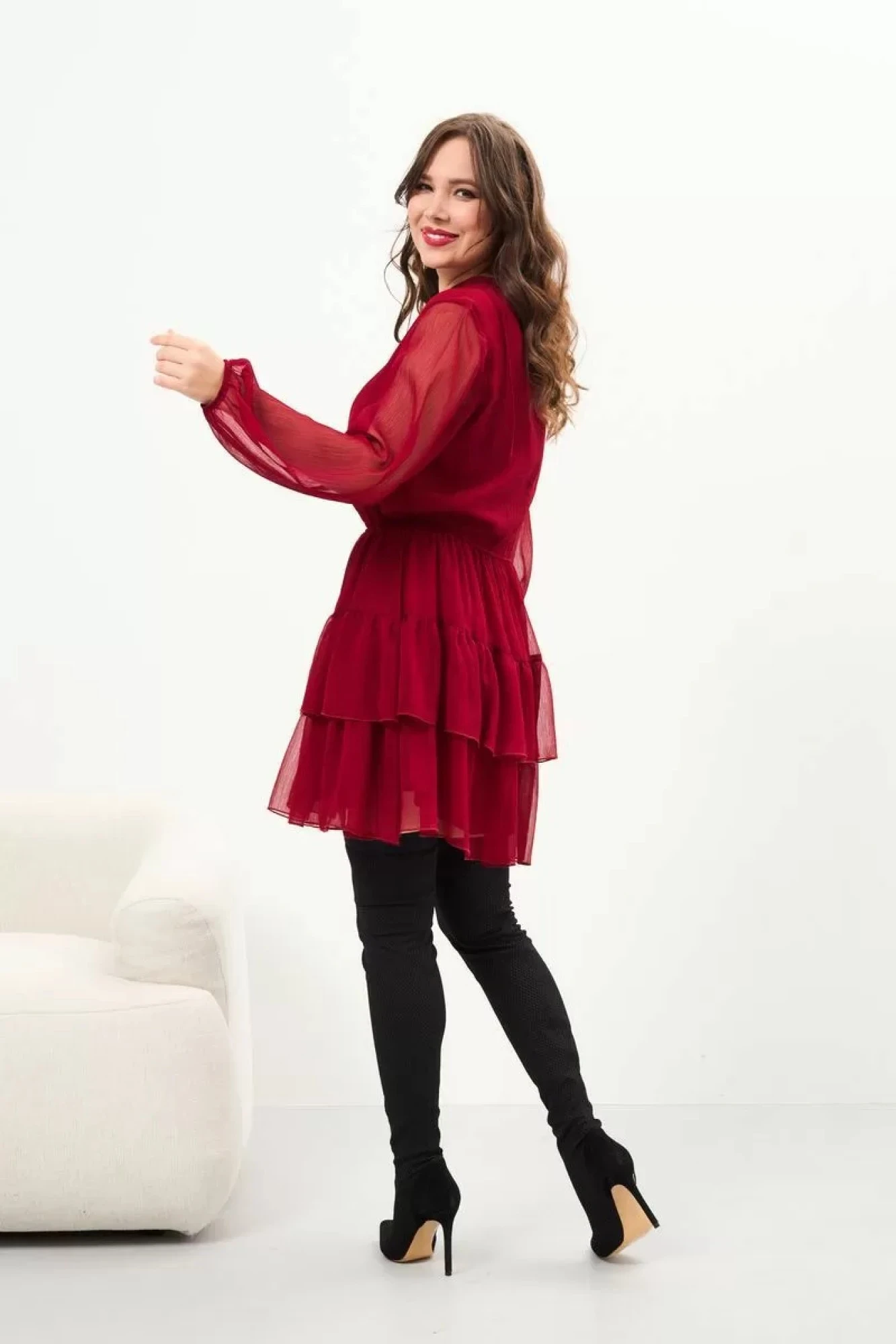 Платье женское из шифоновой ткани на подкладке, отрезное по линии талии, на резинке. Из бокового шва идут грудовые выточки, спинка со средним швом. Воротник-стойка, с завязкой. Юбка с двумя воланами, рукав вточной, низ на резинке.