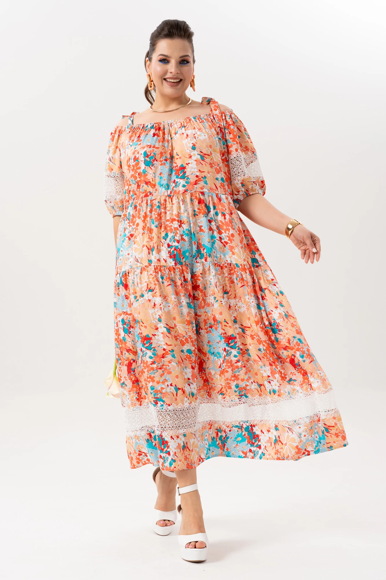 Платье из премиальной вискозы с эффектом шёлка, легкое и очень комфортное, приятное к телу, на завязывающихся бретельках по плечам, силуэта транеция. С притачными воланами, со сборкой, с боковыми карманами в швах. Рукава 3/4, со вставкой из кружева, низ рукавов на резинке. Вырез горловины с эластичной тесьмой, что позволяет носить платье на плечах, и со спущенными плечами.