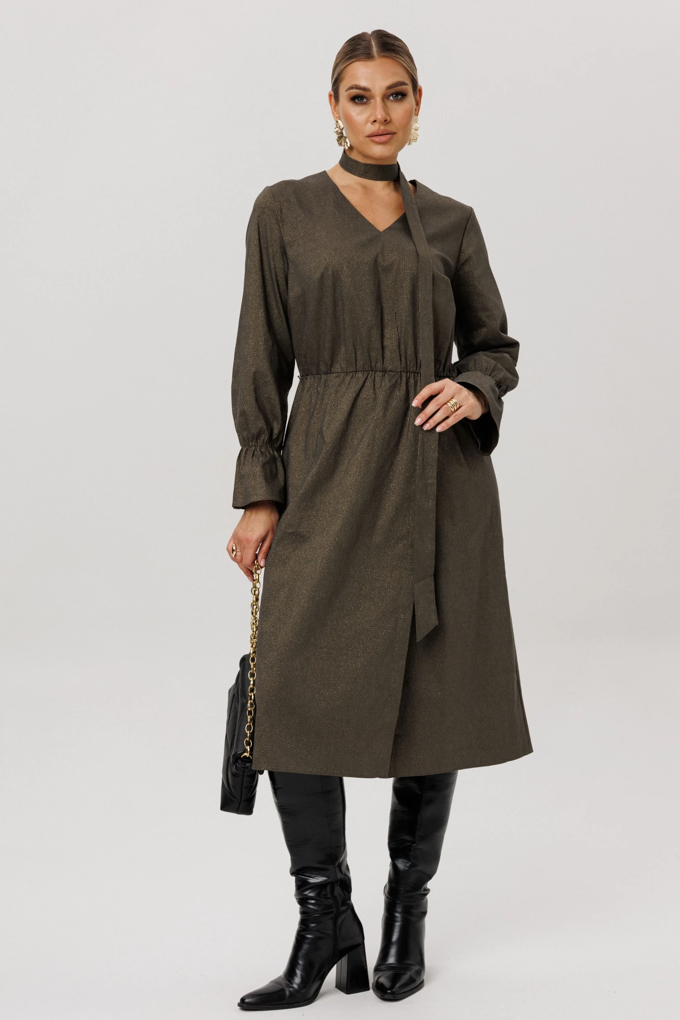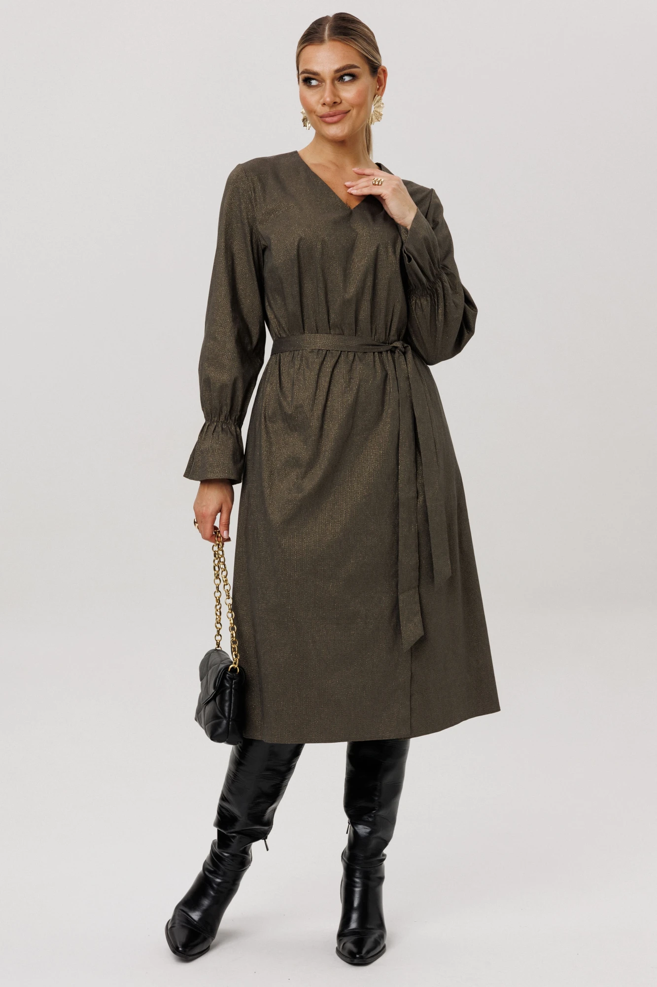 Платье полуприлегающего силуэта миди-длины от Анелли в актуальном темно-зеленом цвете с вкраплениями золотых нитей станет главным элементом вашего гардероба.