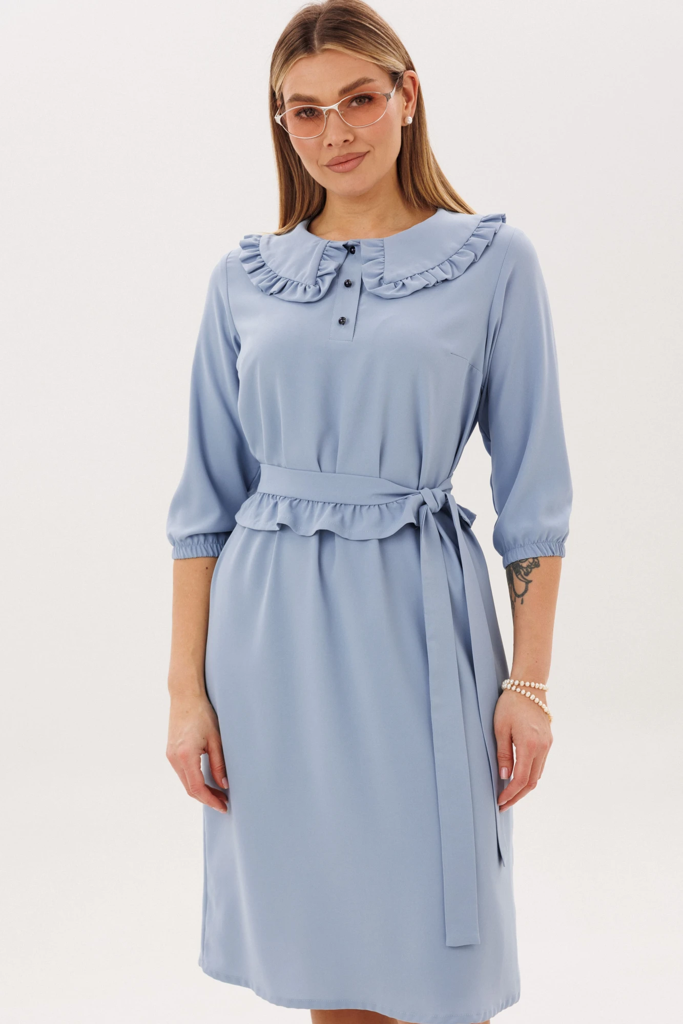 Застежка на петли пуговицы до талии, дополненная нагрудными вытачками, создает изысканное и аккуратное оформление передней части платья. Круглый вырез горловины обработан отложным воротником с рюшем, придающим платью шарм и изысканность. В комплекте идет съемный пояс, который позволяет подчеркнуть вашу талию, либо оставить свободный и расслабленный образ без него.