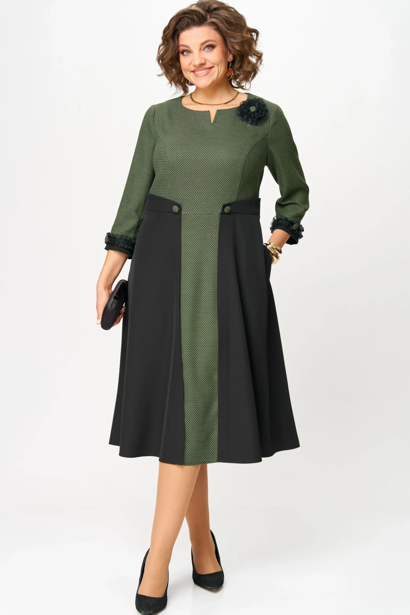 Платье полуприлегающего силуэта, отрезное по линии талии. Горловина с фигурным вырезом, обработана обтачкой. По переду лифа — рельефные швы. По спинке лифа талиевые вытачки и средний шов, в котором обработана потайная молния. Юбка платья ""клеш"", с вертикальной вставкой по переду и средним швом по спинке. Подрез по талии закрывается декоративным поясом с пуговицами. Добавят комфорта при носке функциональные карманы в боковых швах. Рукав втачной прямой, длиной ¾, по низу — манжет, декорированный тесьмой и пуговицой. В комплекте к платью прилагается съемное украшение из тесьмы.