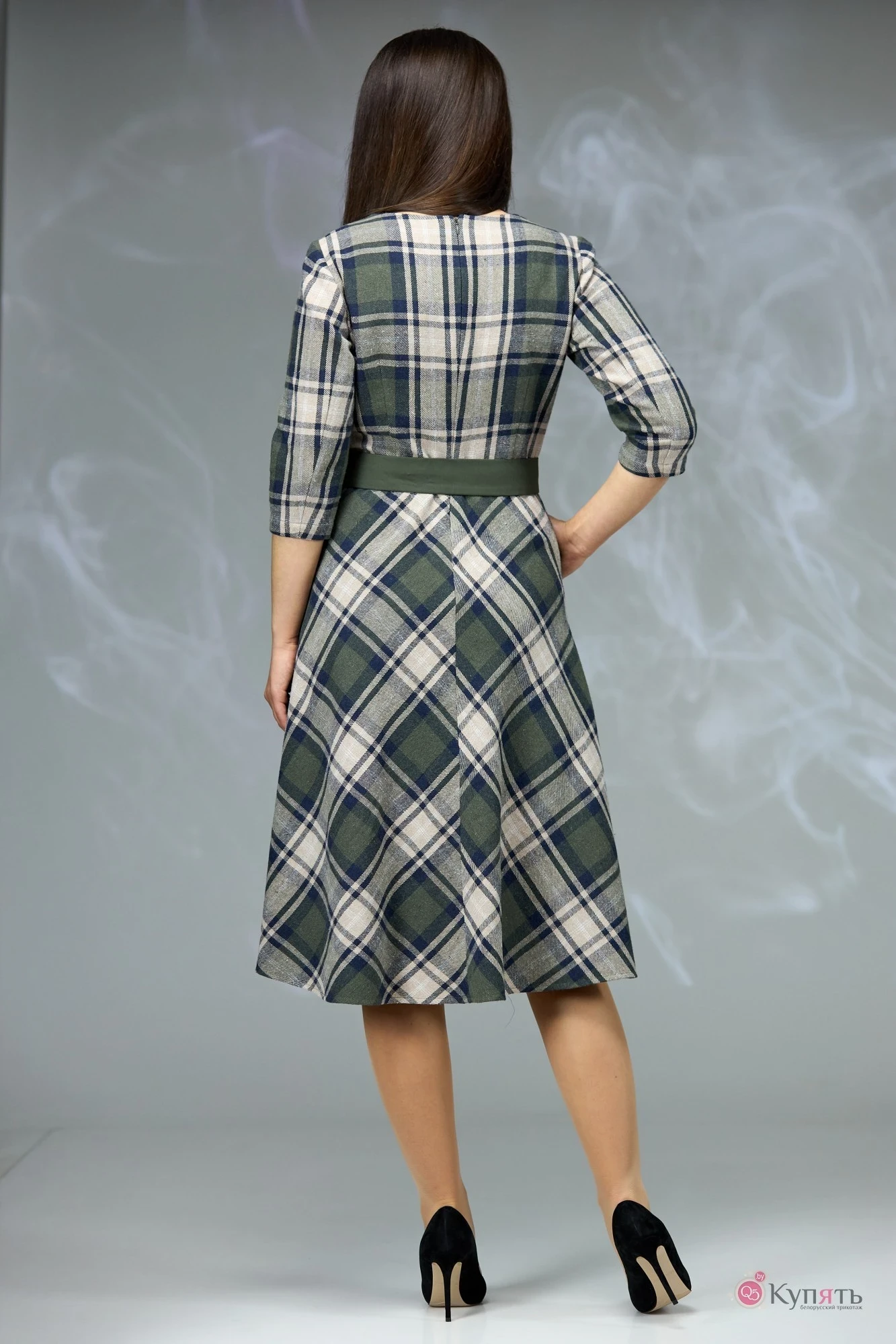 Классическое женское платье отрезное по линии талии. Лиф платья по переду с рельефными швами, на горловине небольшой декоративный разрез. Спинка лифа со средним швом, в котором находится потайная молния. Приталивание спинки лифа достигается при помощи талиевых вытачек. Юбка платья солнце-клеш. Рукав прямой 3/4, одношовный. Горловина платья обработана обтачкой. К платью прилагается съемный пояс. Длина изделия по спинке 115 см. Модель подойдет на рост 164-170 см