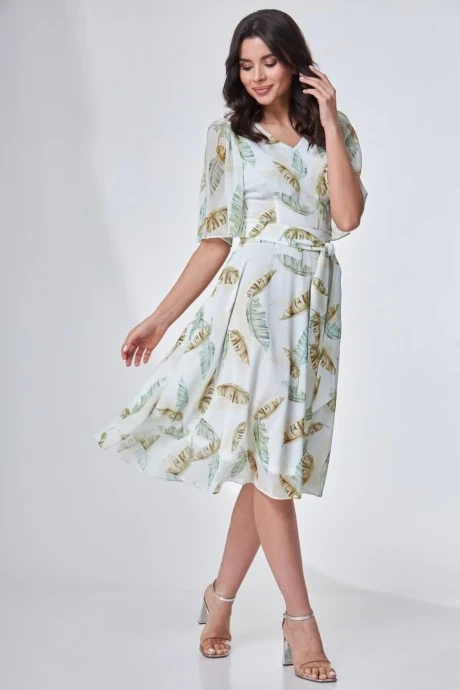 Платье полуприлегающего силуэта, расклешенное книзу, на трикотажной подкладке. Горловина V-образной формы. Платье отрезное по линии талии. По переду нагрудные и талиевые вытачки. Спинка с рельефами и потайной застежкой молнией в среднем шве. Рукав втачной расклешенный короткий, со сборкой по окату. В комплекте съемный пояс из основной ткани.