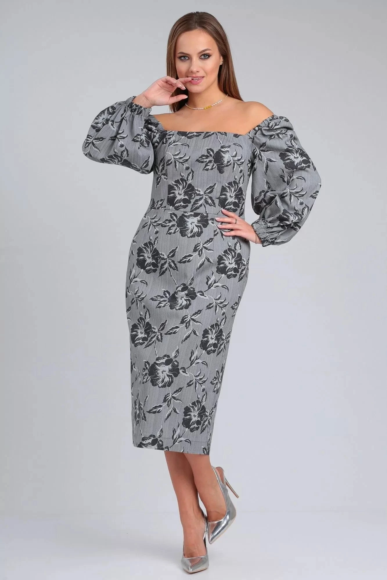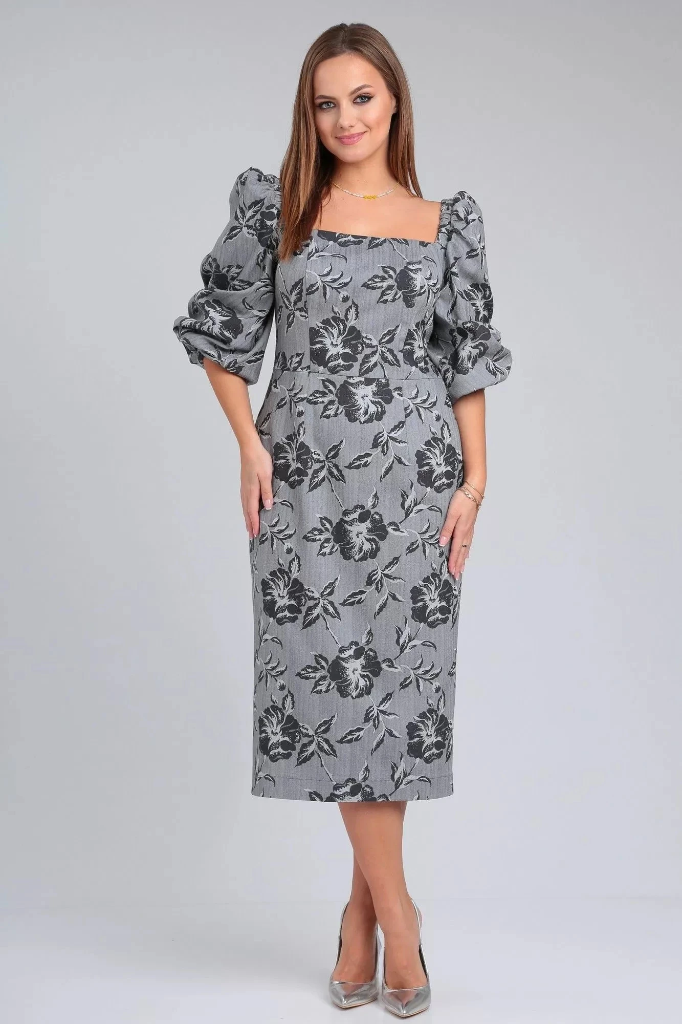 Платье приталенного силуэта длину чуть ниже колена из костюмно-плательной ткани. Вырез горловины квадратной формы. Отрезное по линии талии. Перед и спинка с рельефами. По спинке средний шов, в котором вставлена потайная молния, внизу разрез. Рукав втачной широкий длинный, по окату собран на резинку. Длинный рукав легко превратить в три четверти с помощью резинки, вставленной по низу рукава. "