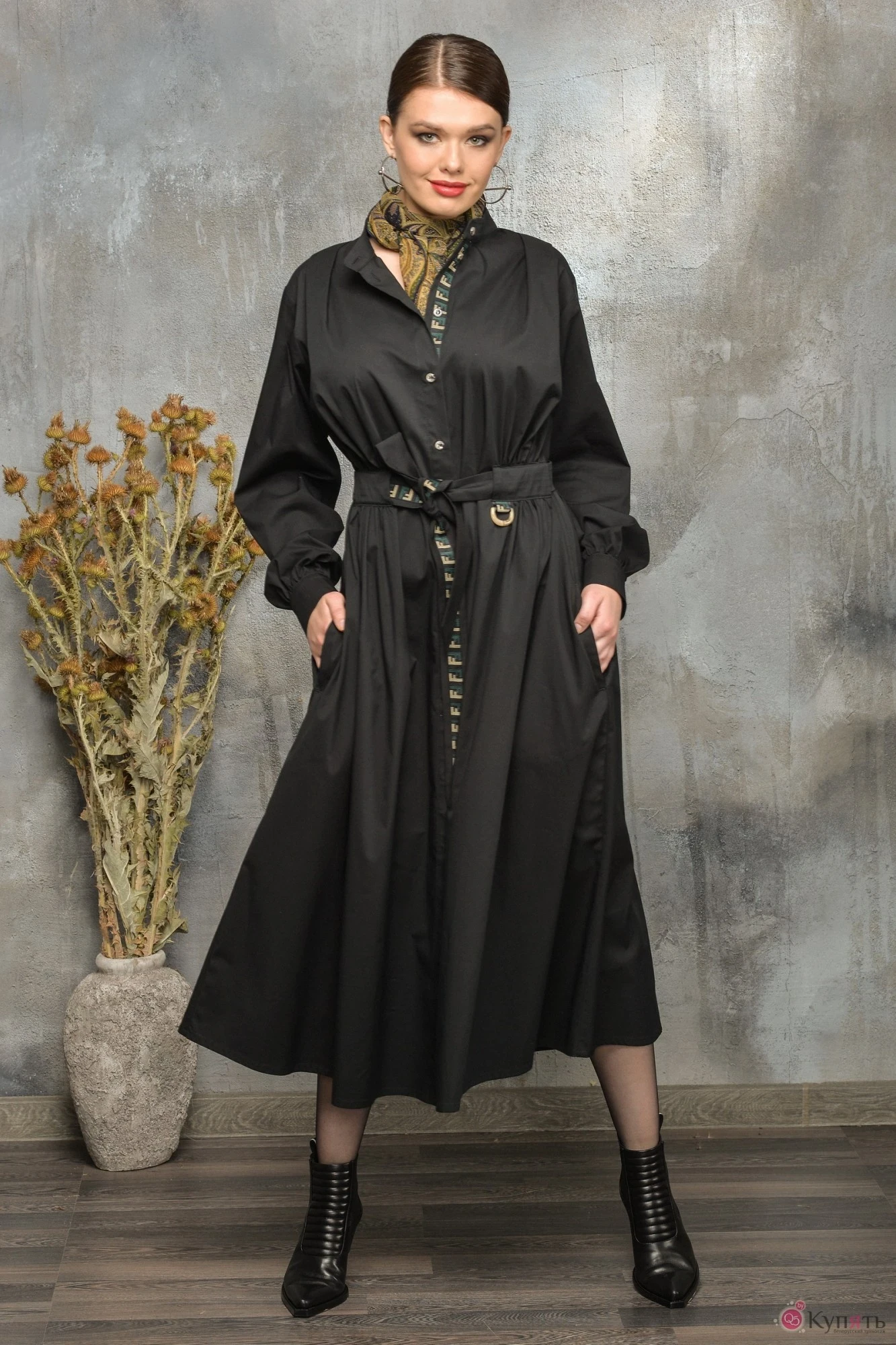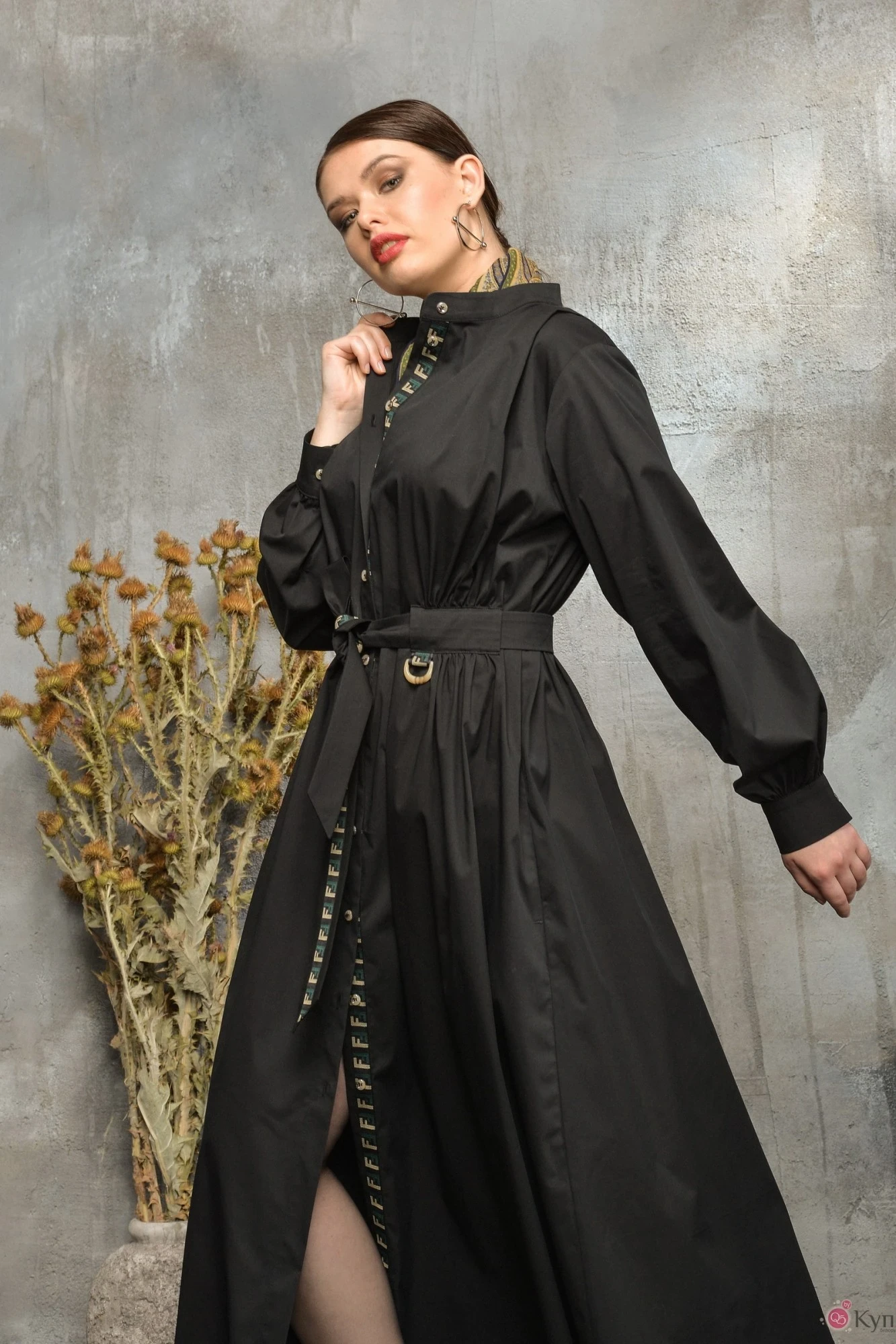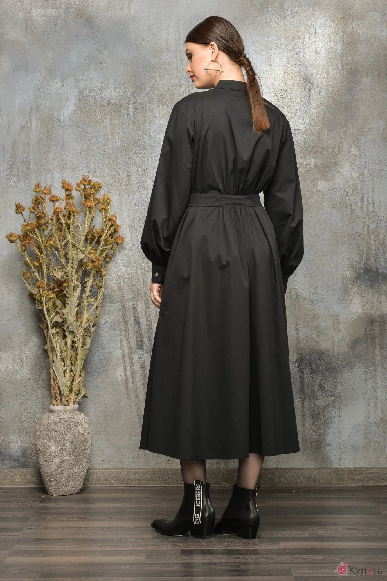 Платье миди Х-силуэта из эластичного хлопка. От плечевых швов заложены складки. По талии сзади и спереди платье присобрано на широкие планки в которые вдет пояс с декоративной тесьмой, формирующий женственные пропорции. Сквозная застежка на пуговицы зрительно вытягивает силуэт. Воротник-стойка. Классические манжеты на рукавах.