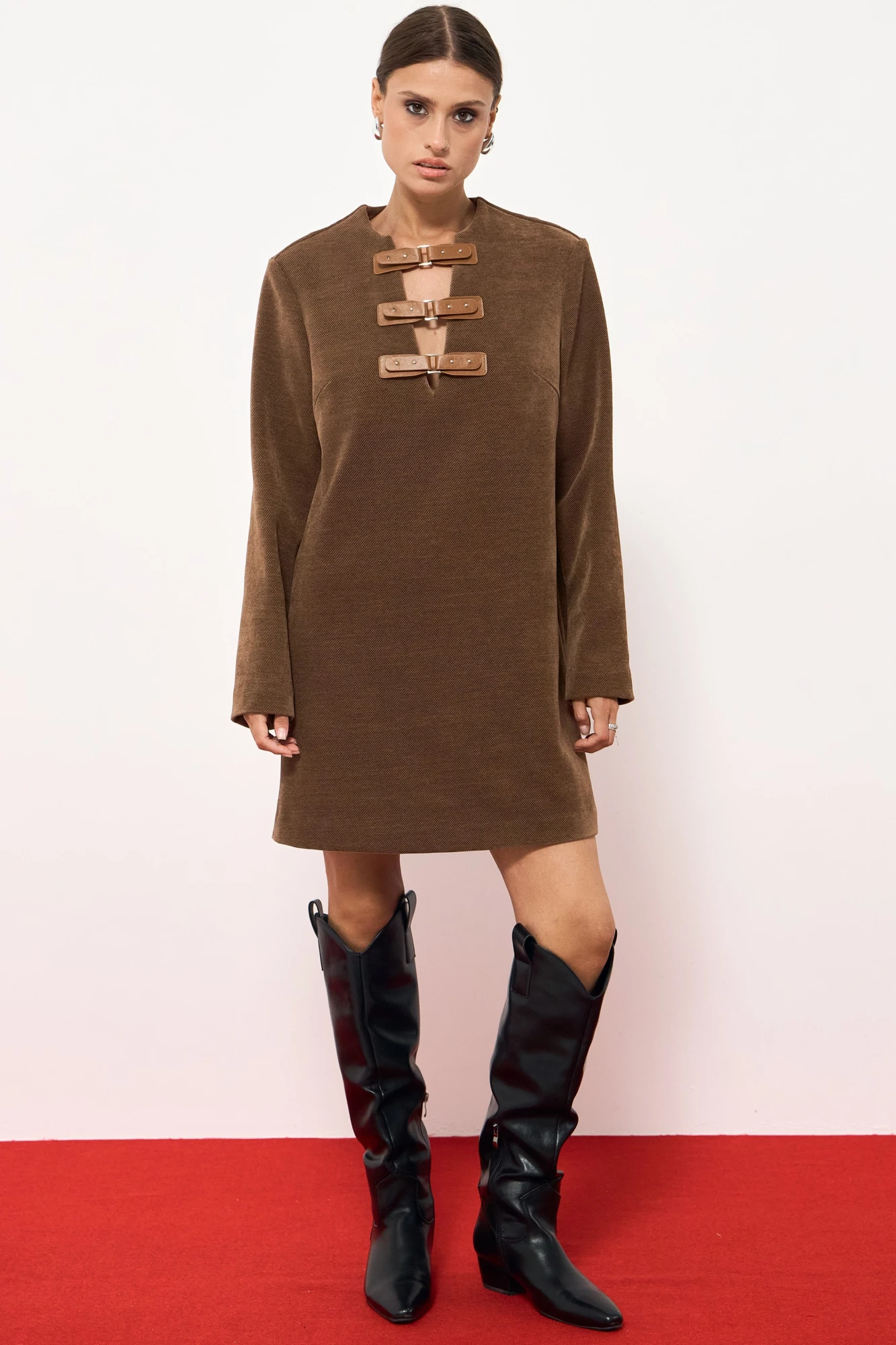 Платье А-образного силуэта в длине мини из костюмной вельветовой ткани. По переду v-образный вырез. По вырезу люверсы с кожаной шнуровкой.