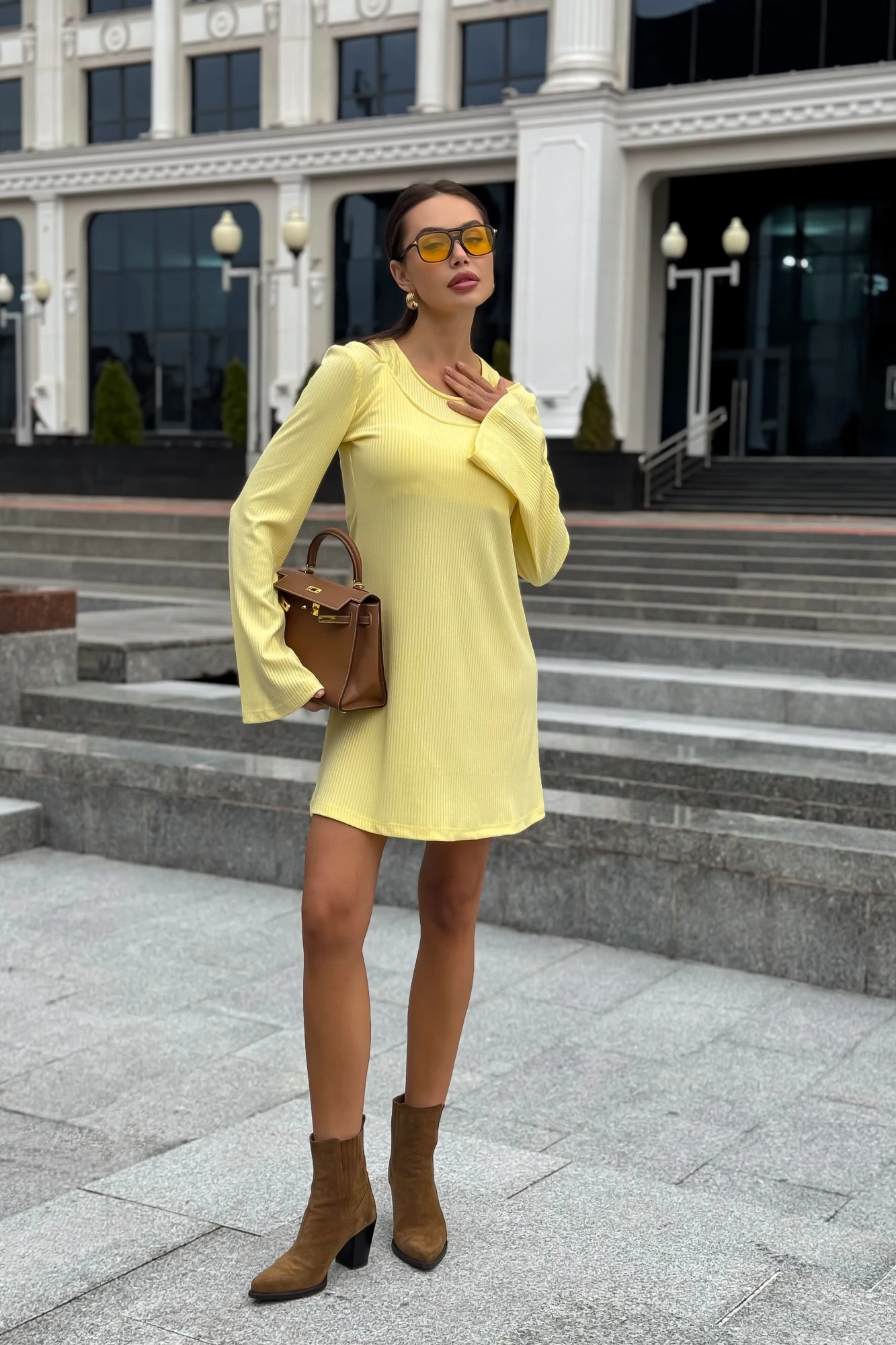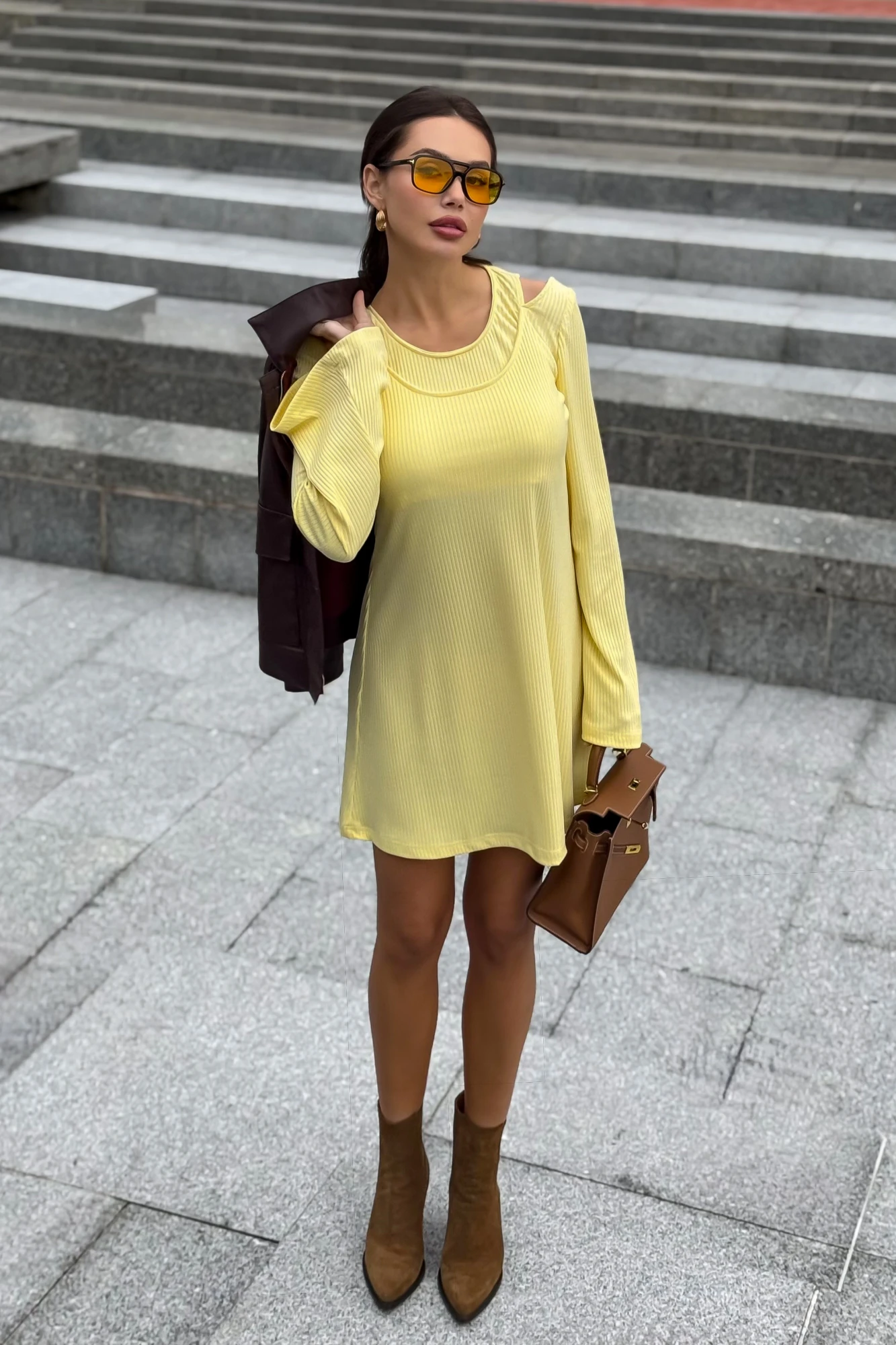 Платье в длине мини, выполнено из трикотажного полотна, который представляет собой ряд выпуклых вертикальных полос из «косичек». Верх платья обработан глубоким вырезом-лодочка и бретелями, имитирующими майку. Рукав расширяется к низу, по форме клеш. Платье хорошо тянется, идеально сядет н афигуру..