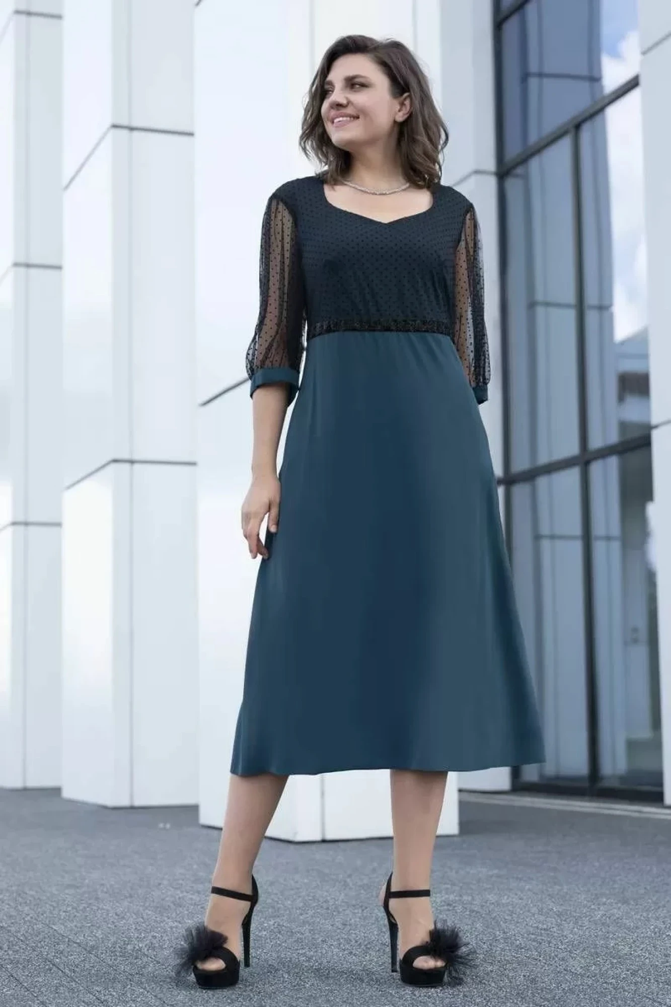 Вечернее платье полуприлегающего силуэта. Застежка на молнию в среднем шве спинки. Ткань костюмно-плательная+декоративная сетка. Ткань немного тянется. В боковых швах удобные карманы.