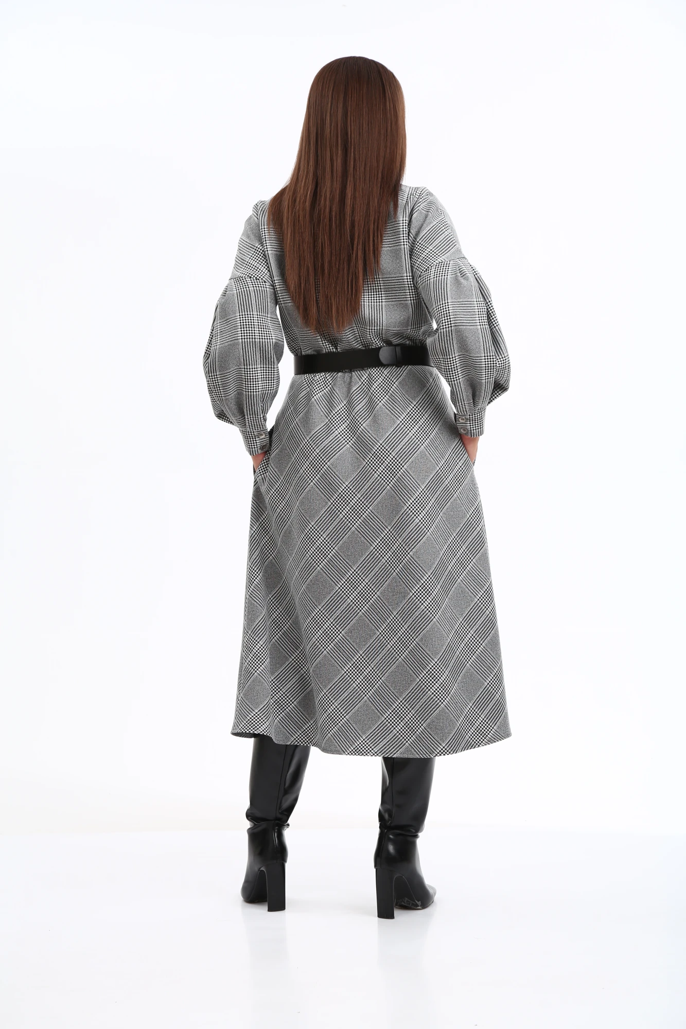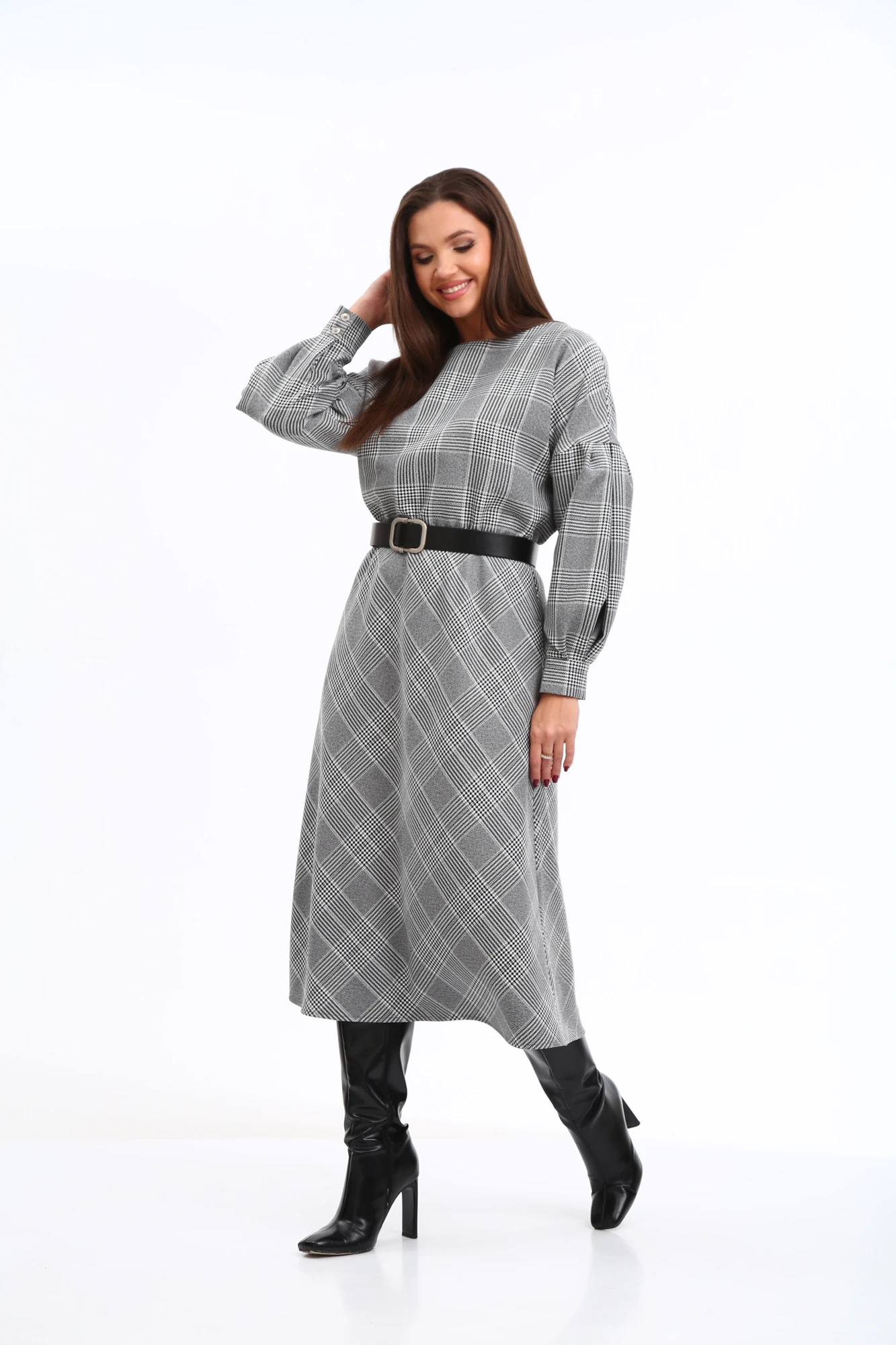 Стильное платье в клетку в трендовой расцветке, безусловно, станет фаворитом в Вашем гардеробе. Изделие выполнено из высококачественной ткани, приятной к телу. Платье А-образного силуэта, отрезное по линии талии. Рукава спущенные с активными защипами, полной длины, с притачными манжетами с застежкой на петли-пуговицы. Горловина мягкой округлой формы. Нижняя часть платья покроя трапеция. В боковых швах предусмотрены функциональные карманы. В области талии платье присобрано на эластичную тесьму. Платье дополнено стильным съёмным ремнем.