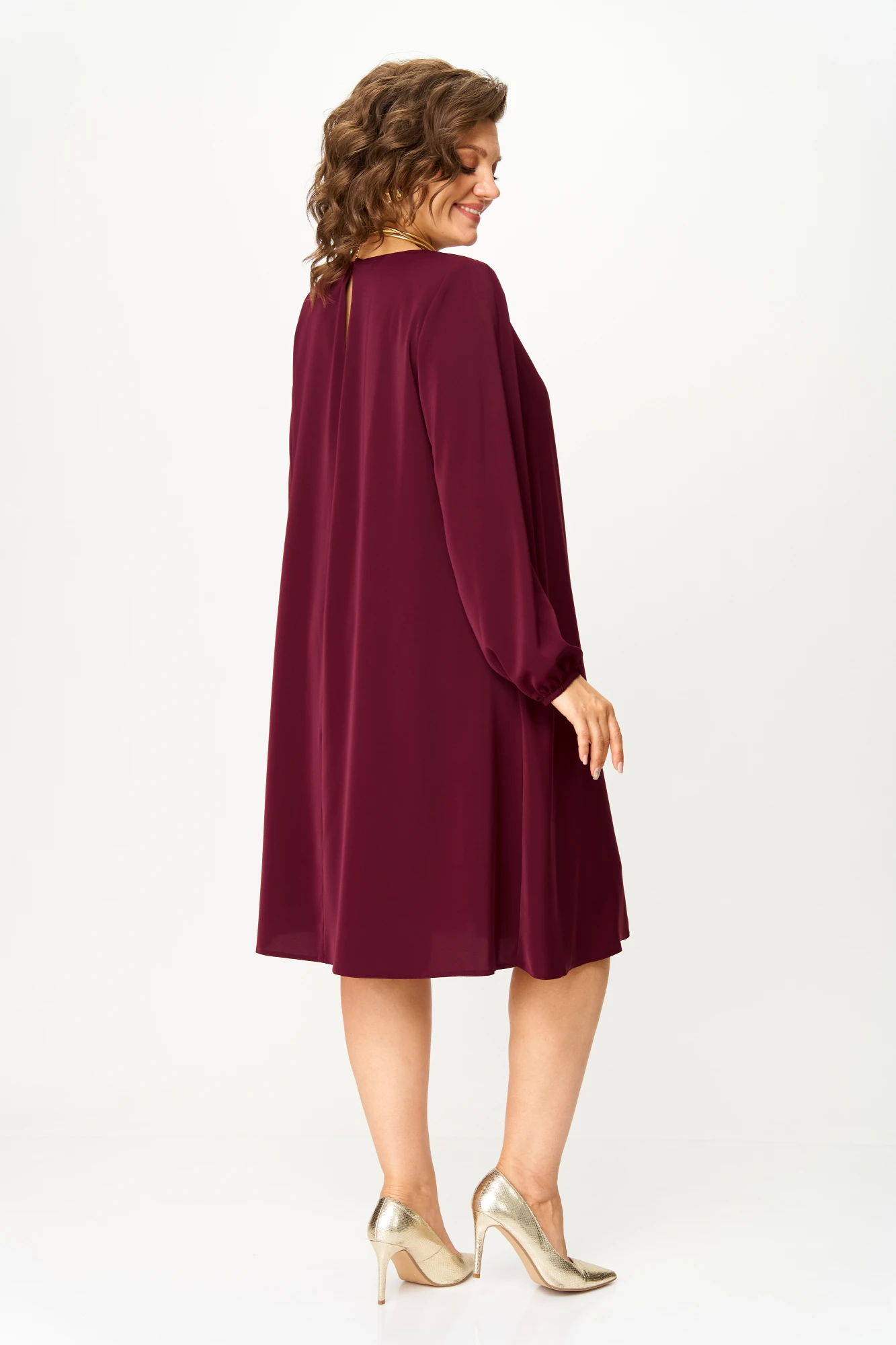 Платье женское А-силуэта. Спинка со средним швом, с вырезом каплей у горловины с фиксацией на петлю и пуговицу. Перед цельнокроеный без вытачки. Рукав втачной одношовный свободной формы, низ рукава зафиксирован резинкой, придавая рукаву легкий напуск.
