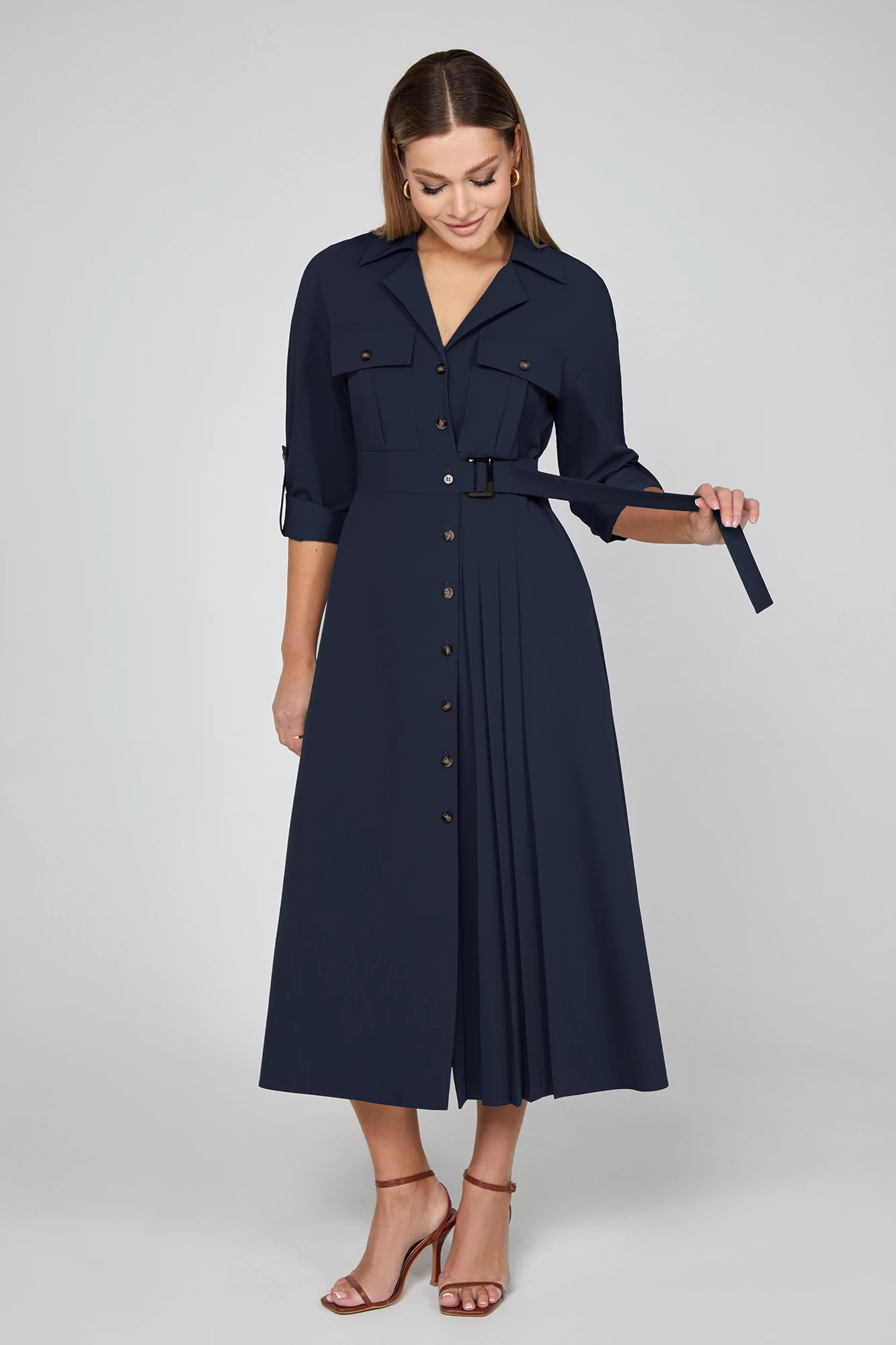 Просто фантастика! Это изысканное платье длиной мидакси с женственным кроем идеально дополняется аккуратным воротником с лацканами и пояском с пряжкой. Дизайн дополняется карманами с клапанами на груди, спущенной линией плеч с притачными рукавами с манжетами, которые при желании можно подвернуть и зафиксировать при помощи пат и пуговиц. Застежка на пуговицы по всей длине придаёт ему яркий штрих, а карманы в боковых швах добавляют функциональности. Вертикальные складки по детали переда завершают шикарный образ. Высококачественная испанская эластичная ткань также гарантирует износостойкость.