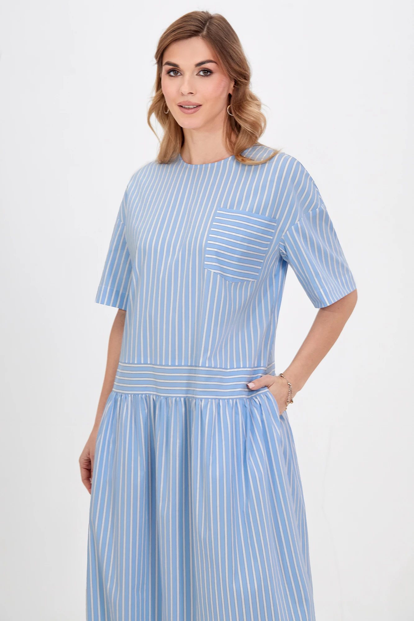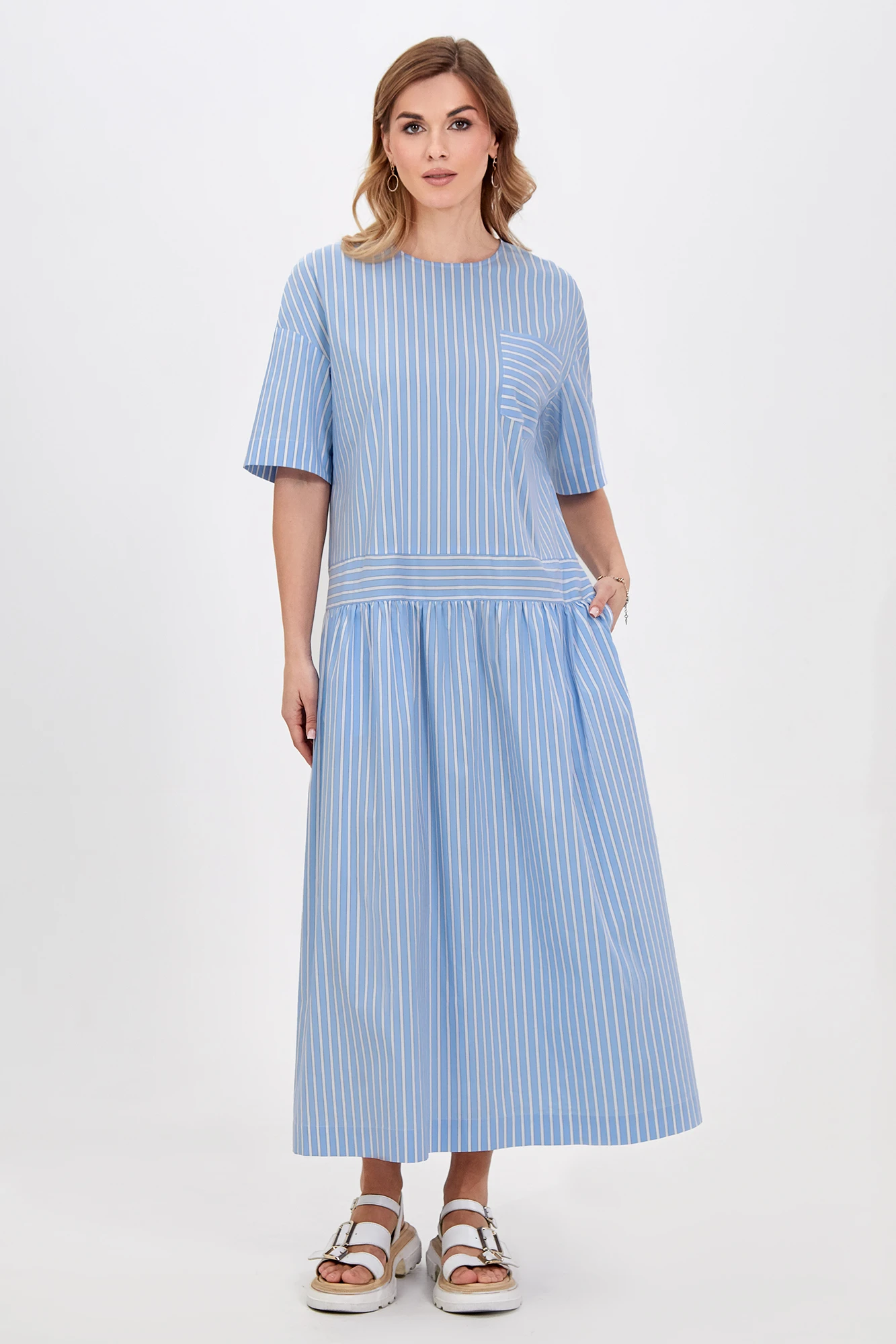 Это платье свободного кроя оптимально подойдет для создания комфортных и стильных кэжуал образов. Материал с высоким содержанием хлопка отлично пропускает воздух и приятен для кожи. Модель с округлой формой горловины со щелевидной застёжкой по спинке на навесную петлю и потайную пуговицу, со спущенной линией плеч с притачными рукавами, фигурным отделочным карманом и функциональными карманами в боковых швах. Акцентным решением стала игра полоски, добавляющая модели больше динамики. Длина позволяет носить платье с обувью как на каблуке, так и на плоском ходу.