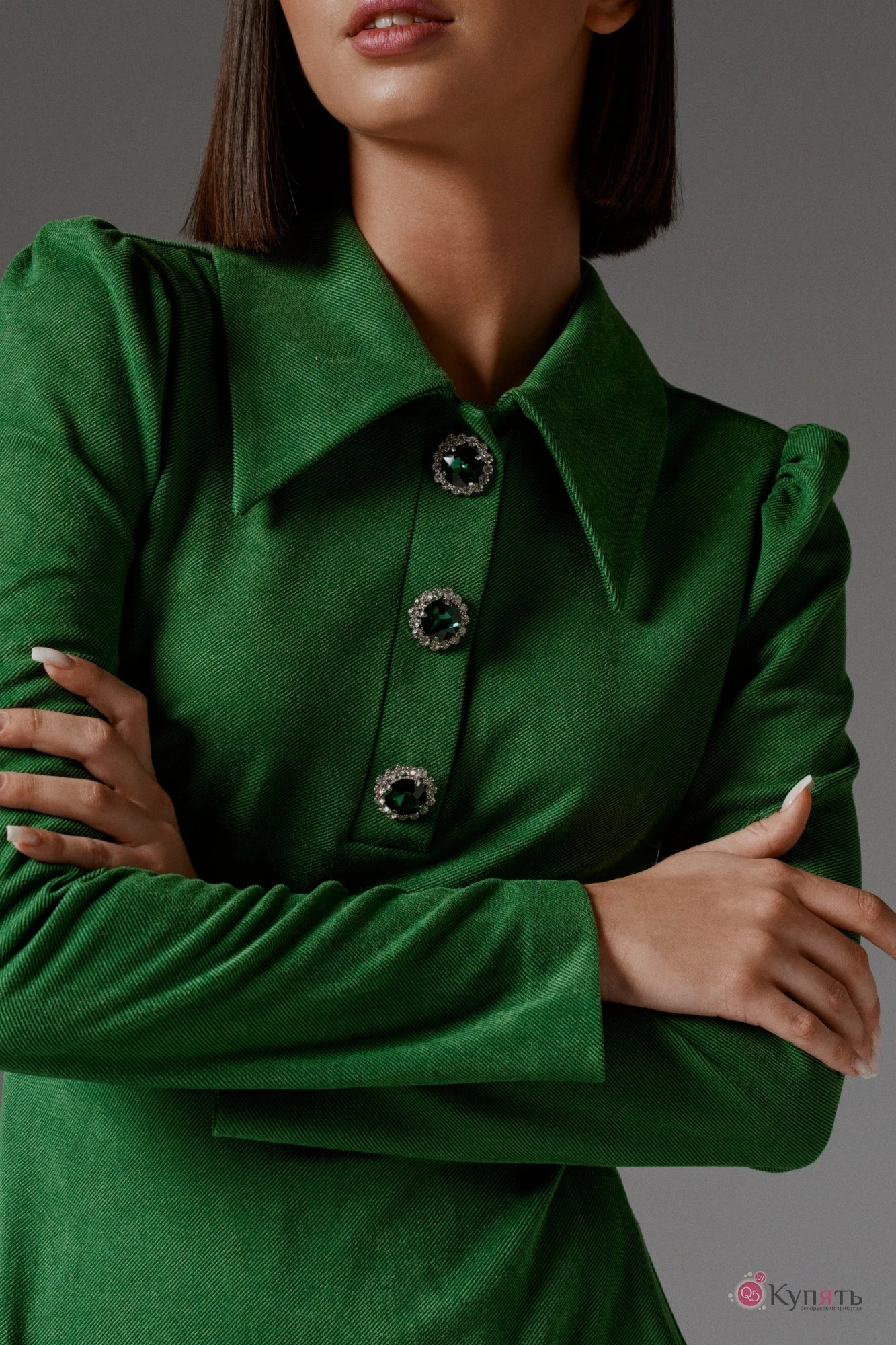 Платье женское полуприлегающего силуэта, отрезное. Воротник остроугольный отложной. Рукав втчаной, со сборкой по окату. По переду нагрудные и таллиевые вытачки. По переду изделия три крупные декоративные пуговицы. Застежка - потайная тесьма молния в среднем шве заднего полотна изделия. Юбка свободного кроя. Длина платья 87 см, длина рукава 62 см.