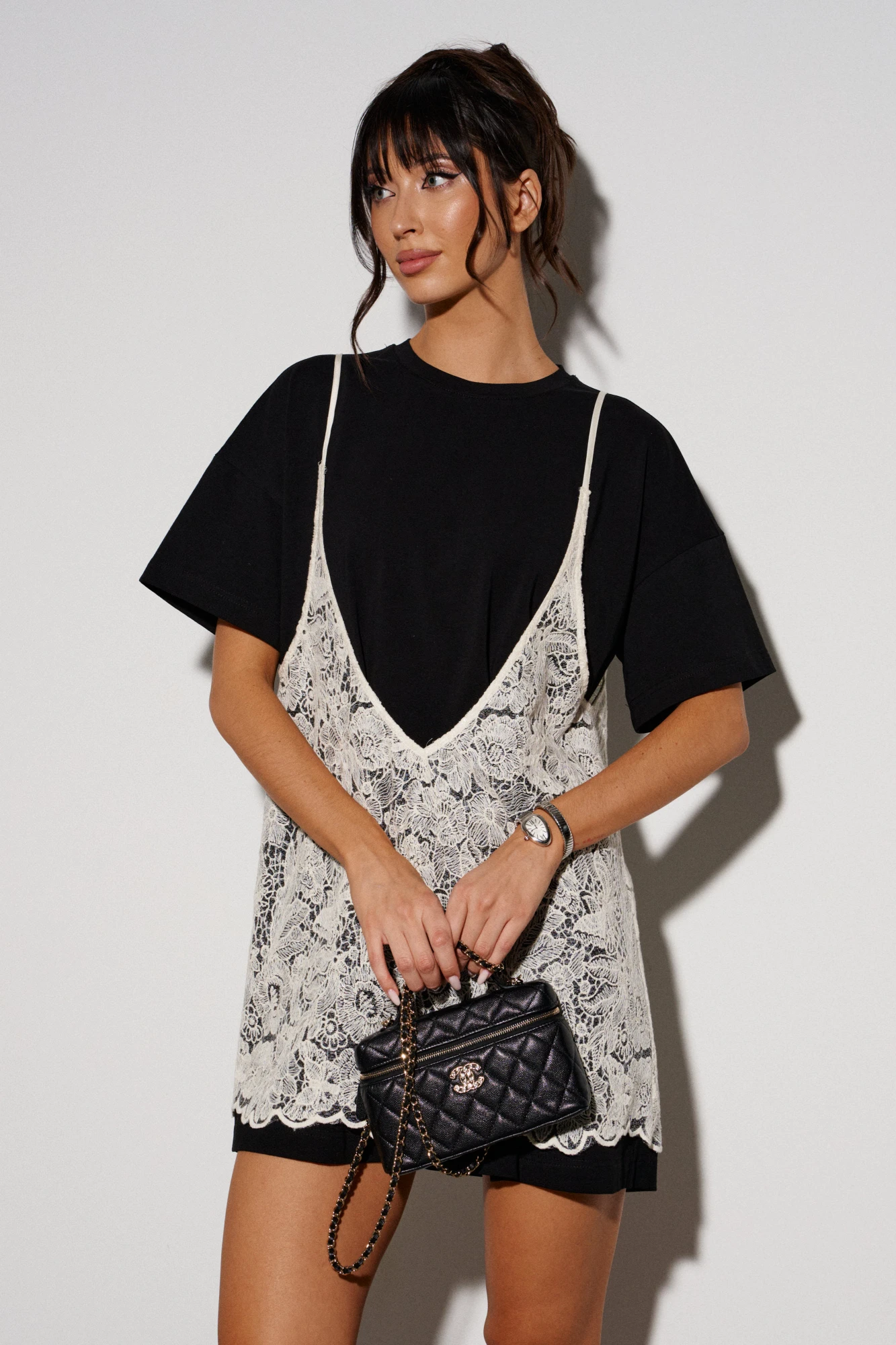 Комплект из двух платьев.Основное платье выполнено из трикотажного полотна чёрного цвета. Вырез горловины круглый .Рукав втачной, спущенный. Длина рукава от линии втачивания 14 см. Длина спинки 82 см.Верхнее платье выполнено из кружева в цвете айвори с пайетками. Вырез декольте V-образный. Бретели регулируемые. Длина по боковому шву 41 см.